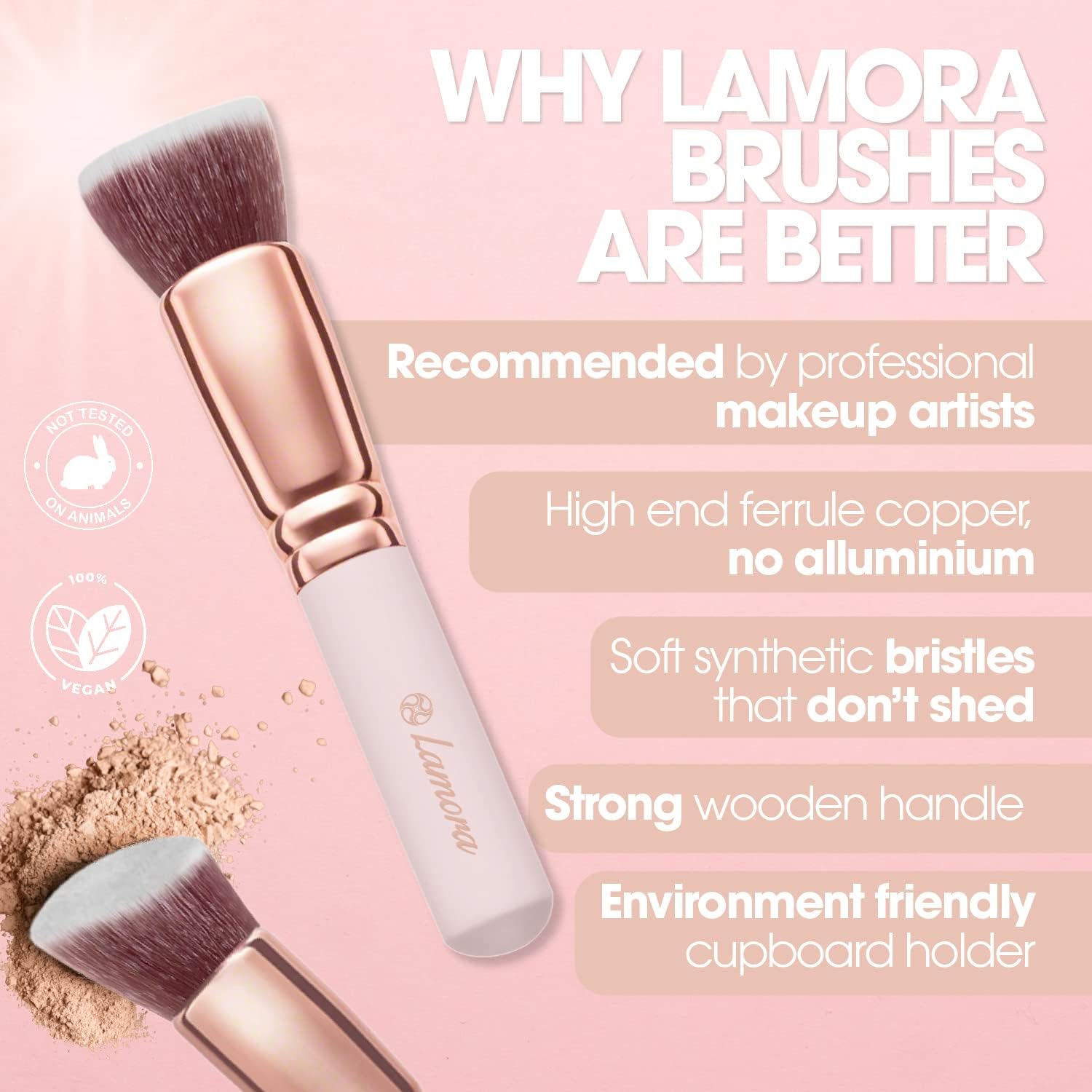 ✓ Forget Mac, Sigma and etc. there is a new standard of quality in the World of Beauty! I LOVE my Lamora kabuki brush set. I have been using them for approximately three weeks. I am not sure of what I did prior to this purchase. LADIES ,it’s a highly qualitative investment, especially if your existence and viability are contingent on a budget. THE BRUSHES DOES NOT SHED, even after washing them. It’s often said that you get what you pay for. But in this case, YOU GET SO MUCH MORE!