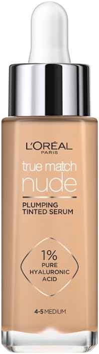 Contents: 1x L’Oréal Paris True Match Nude Plumping Tinted Serum with 1% Hyaluronic Acid, 30 ml, Shade: 4-5 Medium