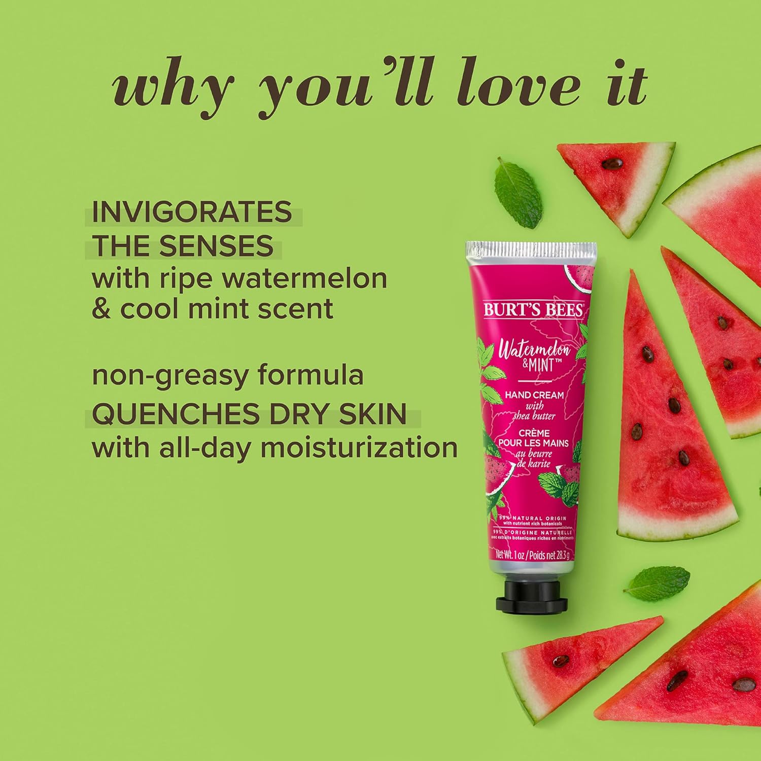 BOTANICAL SCENT: Indulgent hand cream with invigorating Watermelon & Mint scent; Burt’s Bees Botanical Hand Creams come in a variety of natural botanical scents: Lavender & Honey, Orange & Pistachio, Rosemary & Lemon, Watermelon & Mint or Wild Rose & Berry