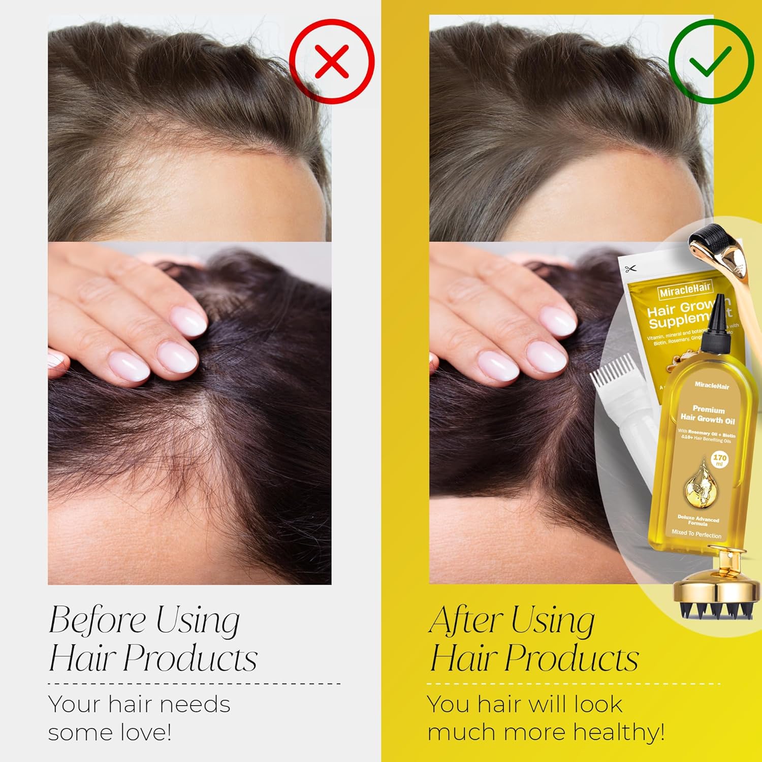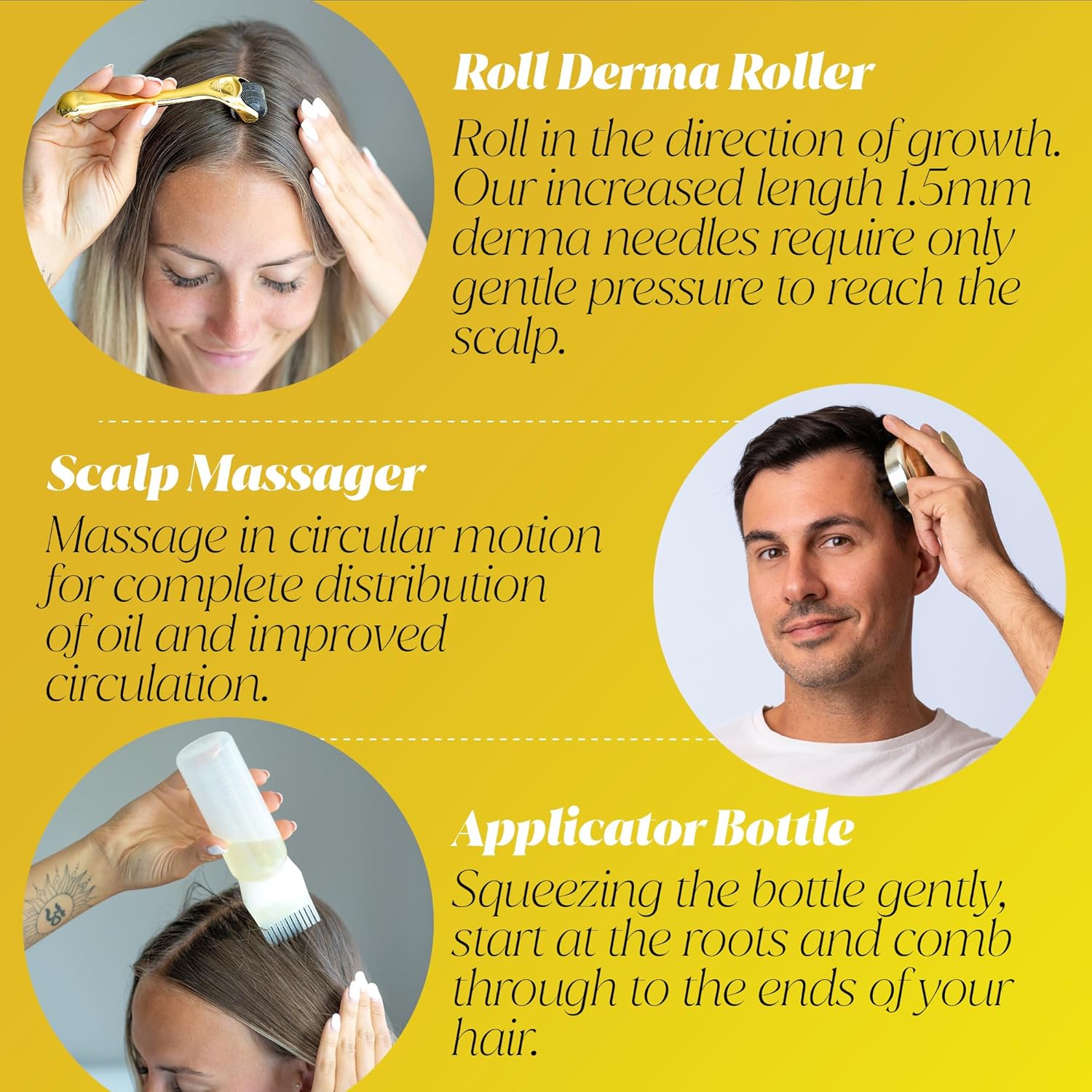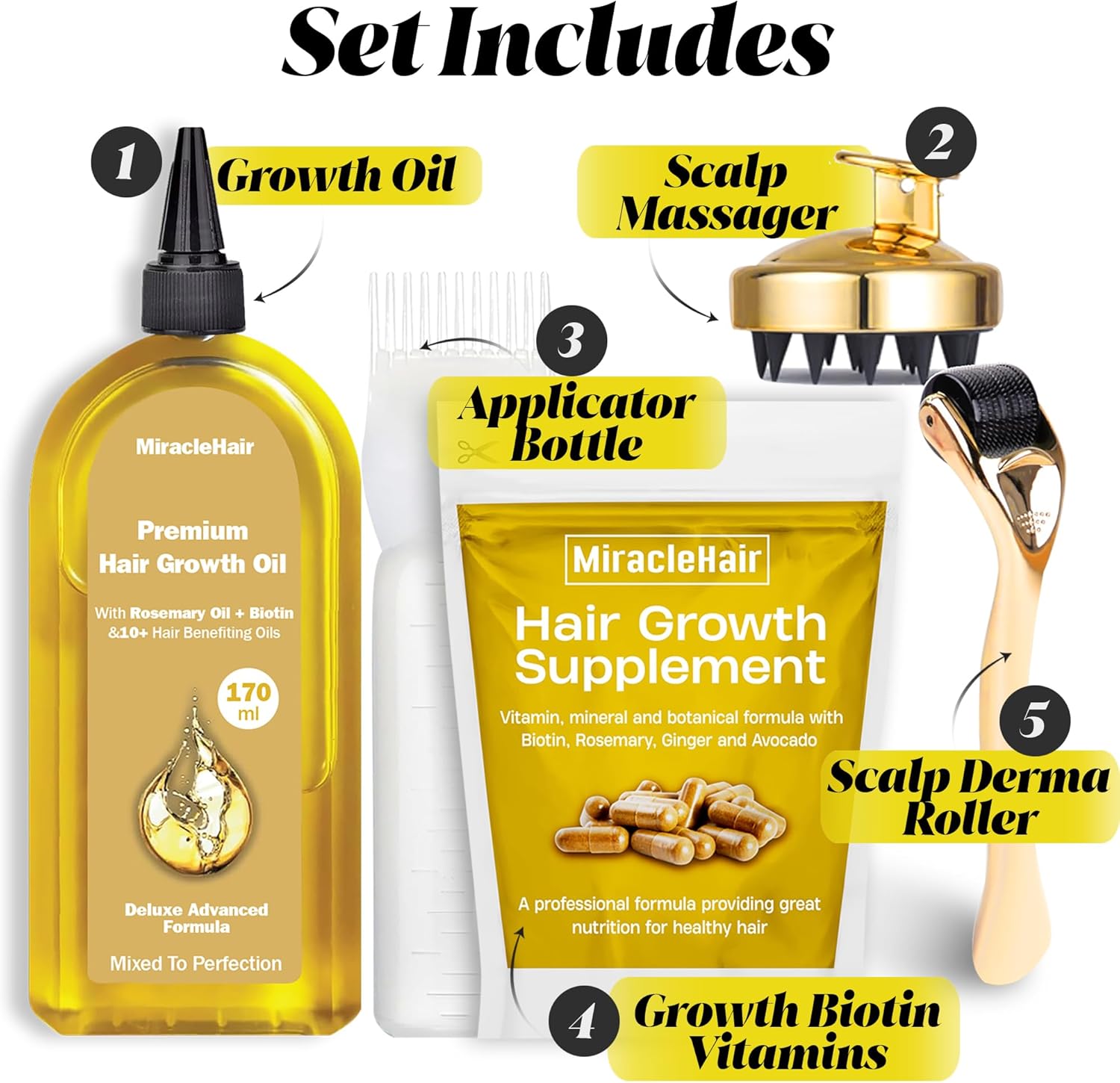 COMPREHENSIVE HAIR GROWTH SOLUTION – Our set includes a 170ml pre-mixed hair growth oil enriched with 12 potent natural oils, a hair growth supplement packed with essential vitamins and minerals, a scalp massager, a 1.5mm derma roller, and an oil applicator bottle – providing a complete regimen for hair health.