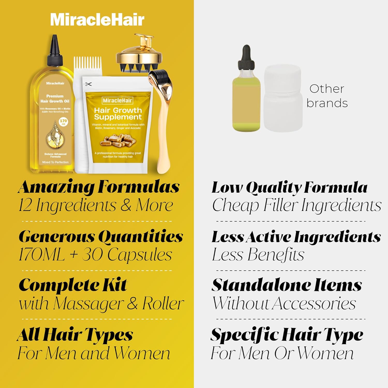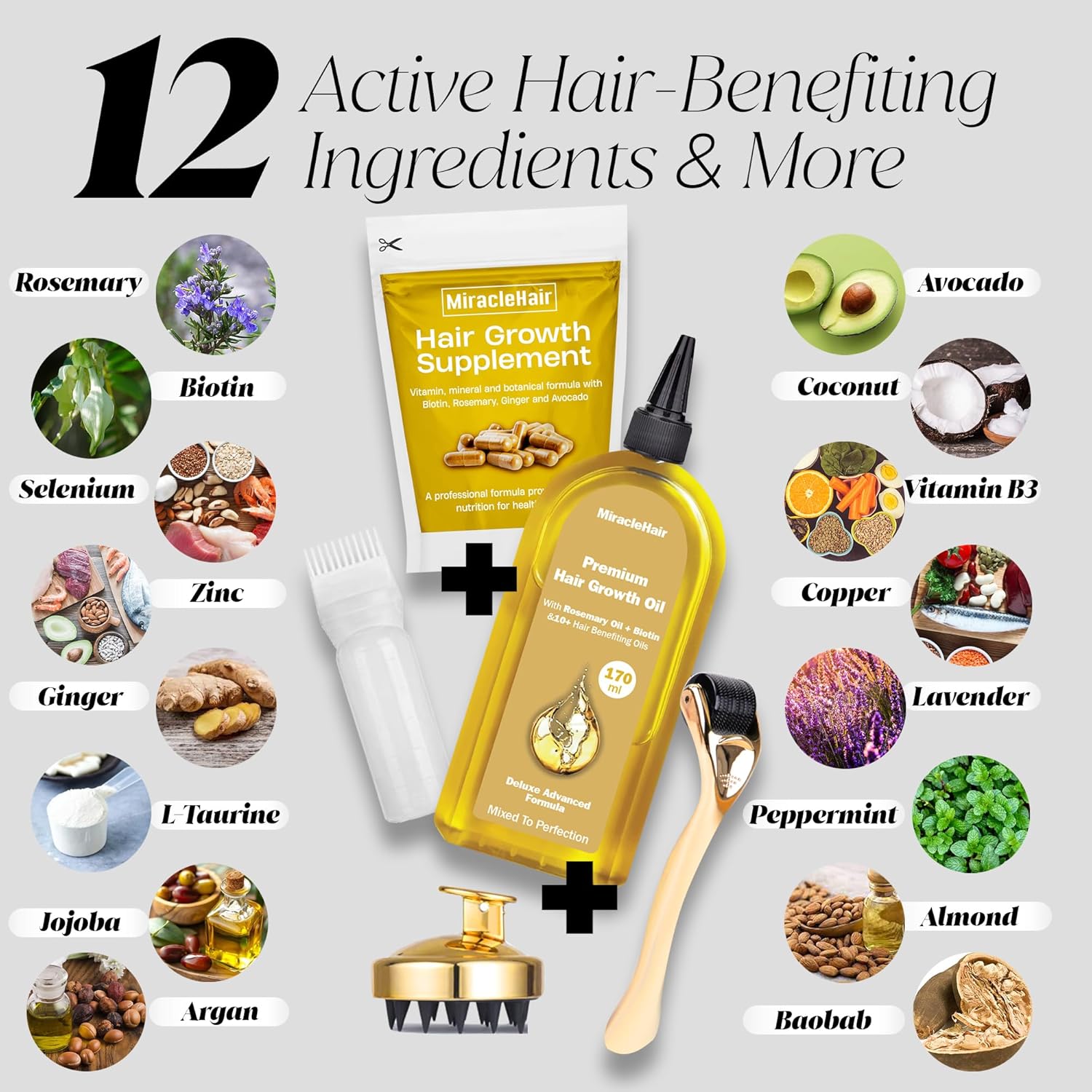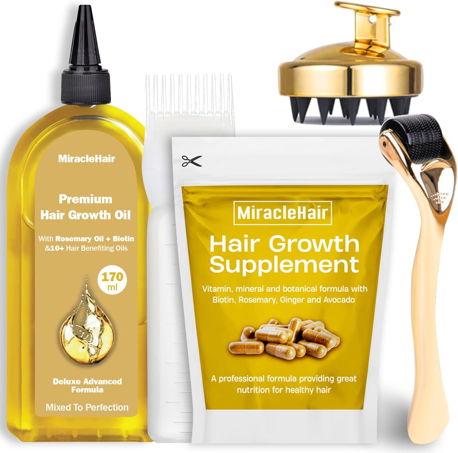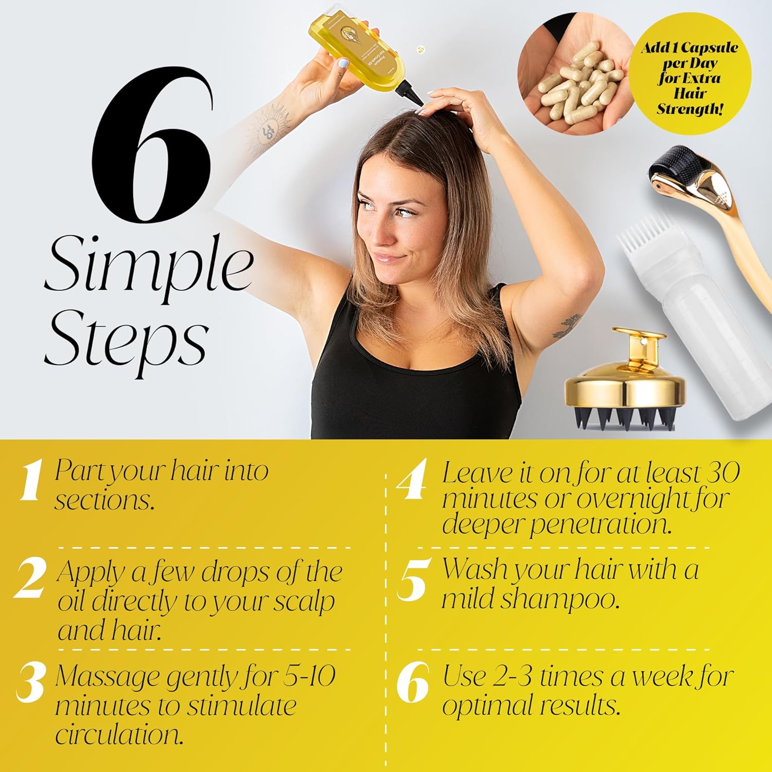 COMPREHENSIVE HAIR GROWTH SOLUTION – Our set includes a 170ml pre-mixed hair growth oil enriched with 12 potent natural oils, a hair growth supplement packed with essential vitamins and minerals, a scalp massager, a 1.5mm derma roller, and an oil applicator bottle – providing a complete regimen for hair health.
