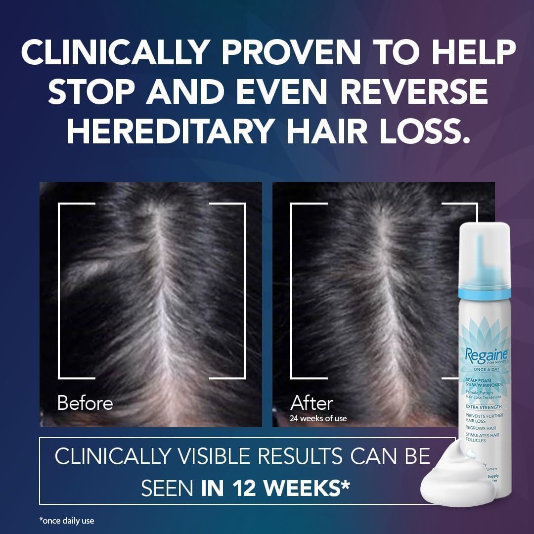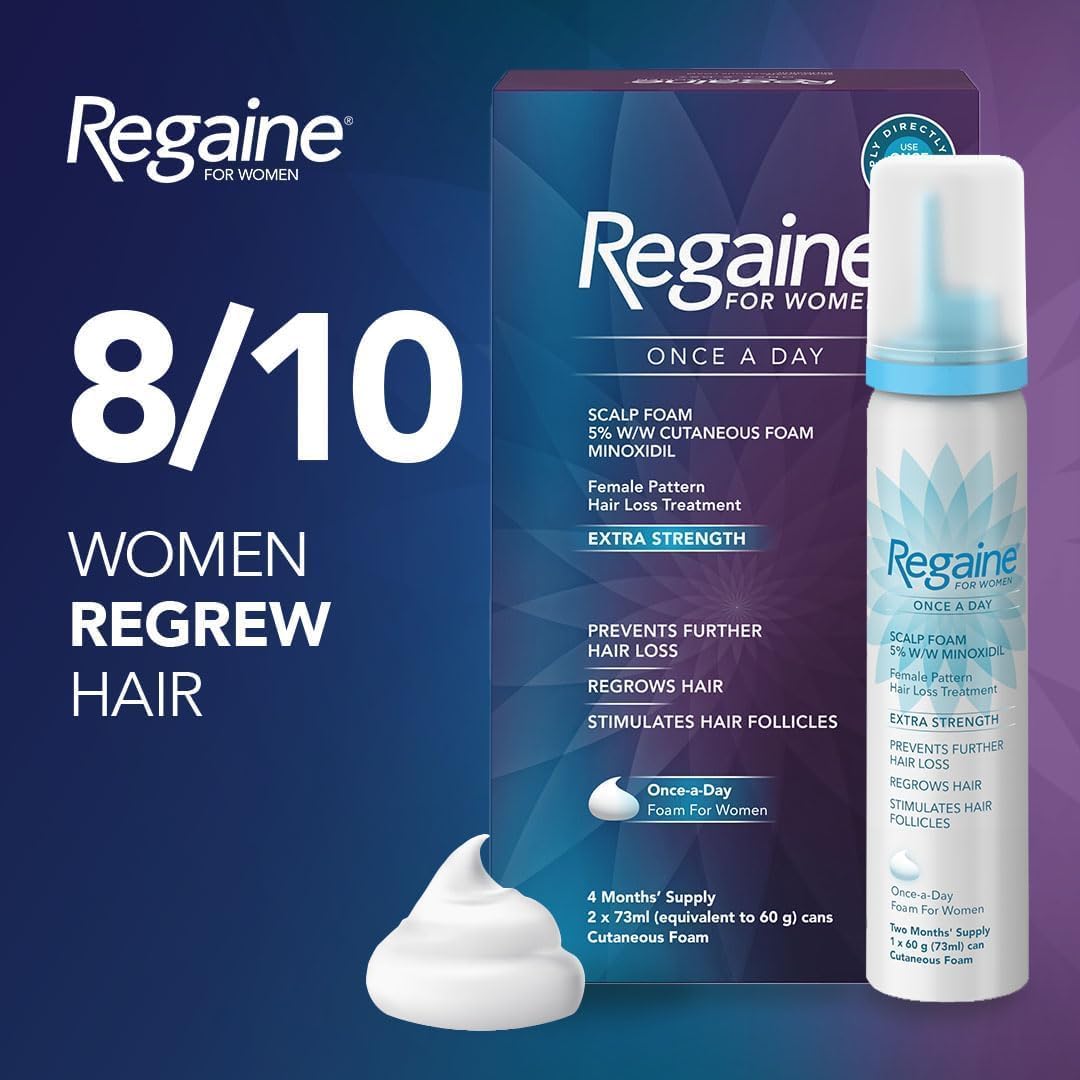REGAINE Hair Regrowth Foam for Women 73ml, 2 Pack, 4 Months’ Supply. REGAINE Hair Regrowth Foam for Women regrows hair in 8 out of 10 women. REGAINE for Women Foam has been developed following 6 years of research and was tested in clinical studies across 5 countries and is the only clinically proven foam to regrow hair. It penetrates the root to help stop hair thinning, reactivates inactive follicles, whilst strengthening and revitalising the hair follicle to grow new, thicker hair. Minoxidil is the only clinically proven treatment for female pattern hair loss and it’s the active ingredient in Regaine for Women Foam and helps to promote hair regrowth in 4 ways: 1.Reverses miniaturisation of follicles 2.Increases blood flow around follicles. 3.Stimulates follicle movement from resting to hair growth phase 4.Extends each follicle’s growth phase. Regaine for women once a day scalp foam 5 Percent w/w cutaneous foam. Contains minoxidil. Always read the label. Regaine For Women Regular Strength Solution is for hereditary hair loss. Contains minoxidil.