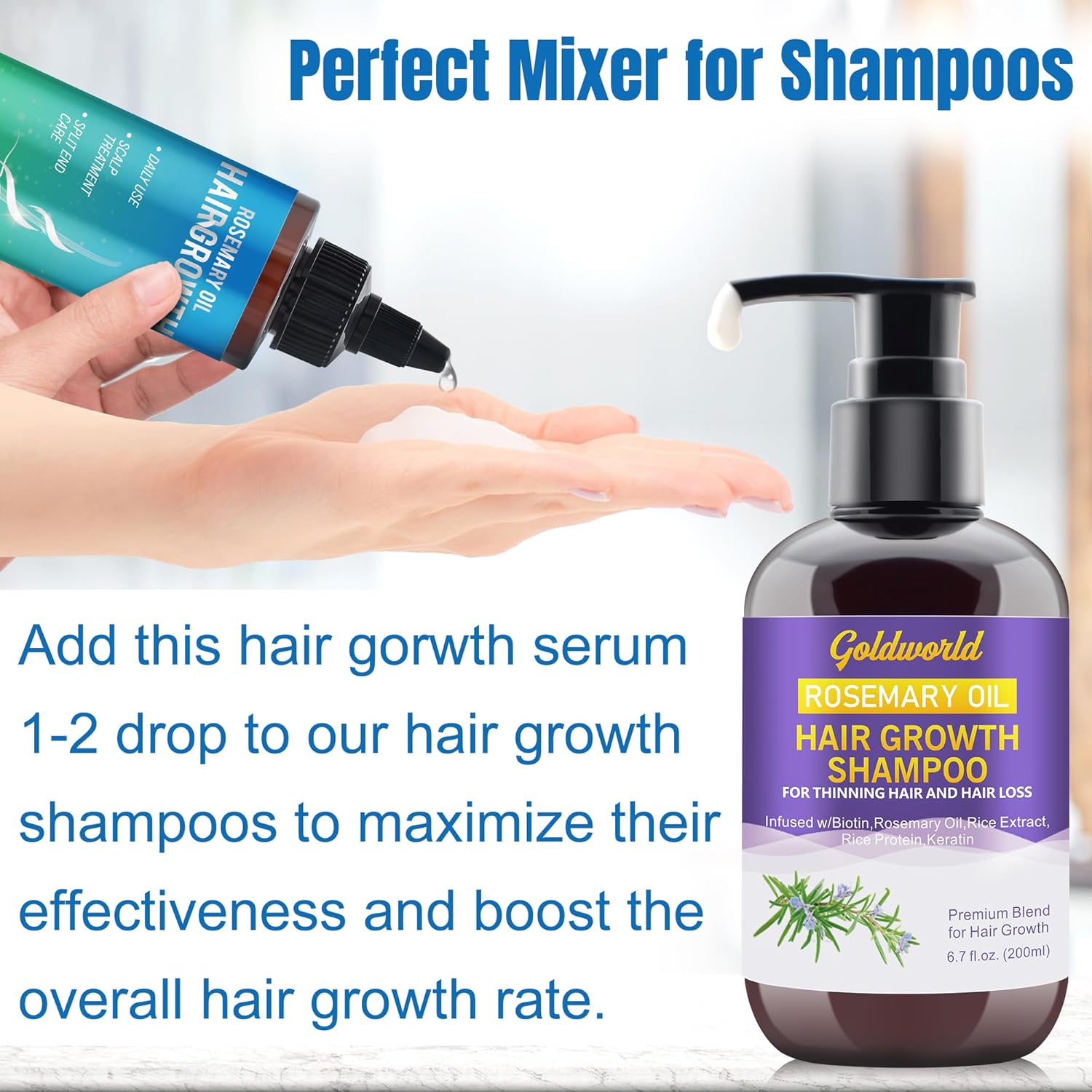 Best Combination of Hair Growth Thickening Product:GOLDWORLD rosemary oil comes with 2 pack hair rosmarin oil which is made from natural ingredients,one of the key ingredients is rosemary oil,which has been used for centuries to promote hair growth,it also contains Grape Seed Oil, Argania Spinosa Kernel Oil, Castor Seed Oil,Tocopherol,Jojoba Seed oil, Olive Fruit Oil, Biotin etc,all best results ingredient in hair care products,this powerful blend works together to promote faster hair growth