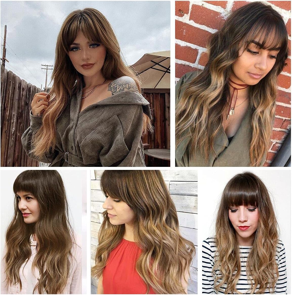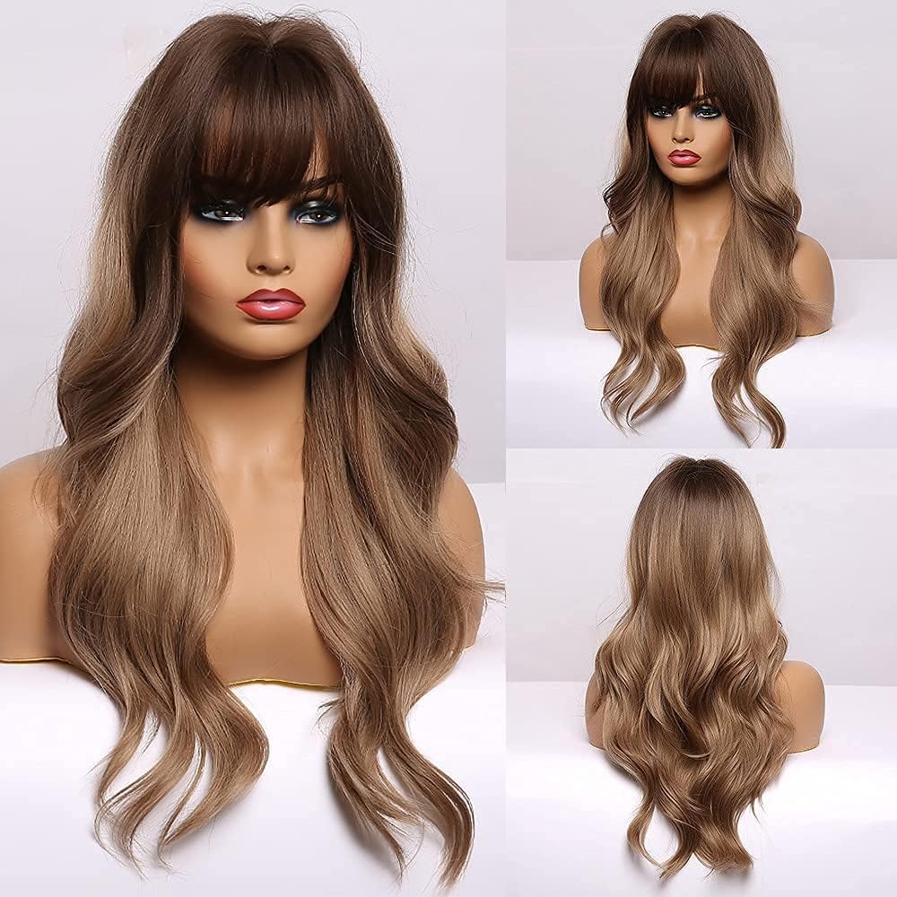 EMMOR Long Wavy Wigs with Bangs Ombre Dark Blonde Wigs for Women, Heat Resistant Synthetic Wigs with Brown Root for Daily/Party/Cosplay (24 Inch,Ombre Dark Ashy Blonde)