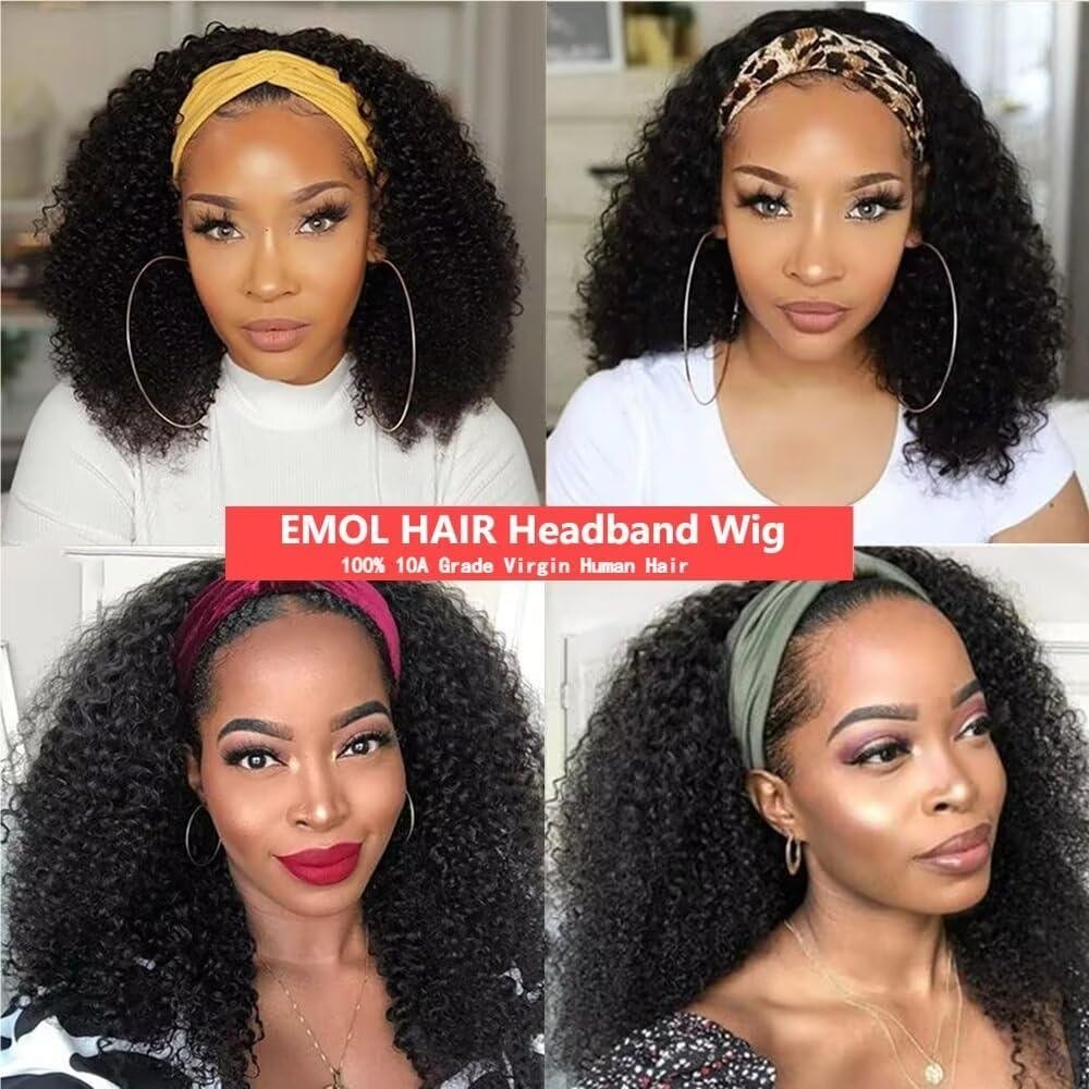 Glueless Wigs Human Hair Kinky Curly Headband Wig For Women 22 Inch Emol Hair Brazilian Virgin None Lace Front Curly Human Hair Wigs For Women Human Hair Scarf No Gel Wig Wear And Go Natural Black