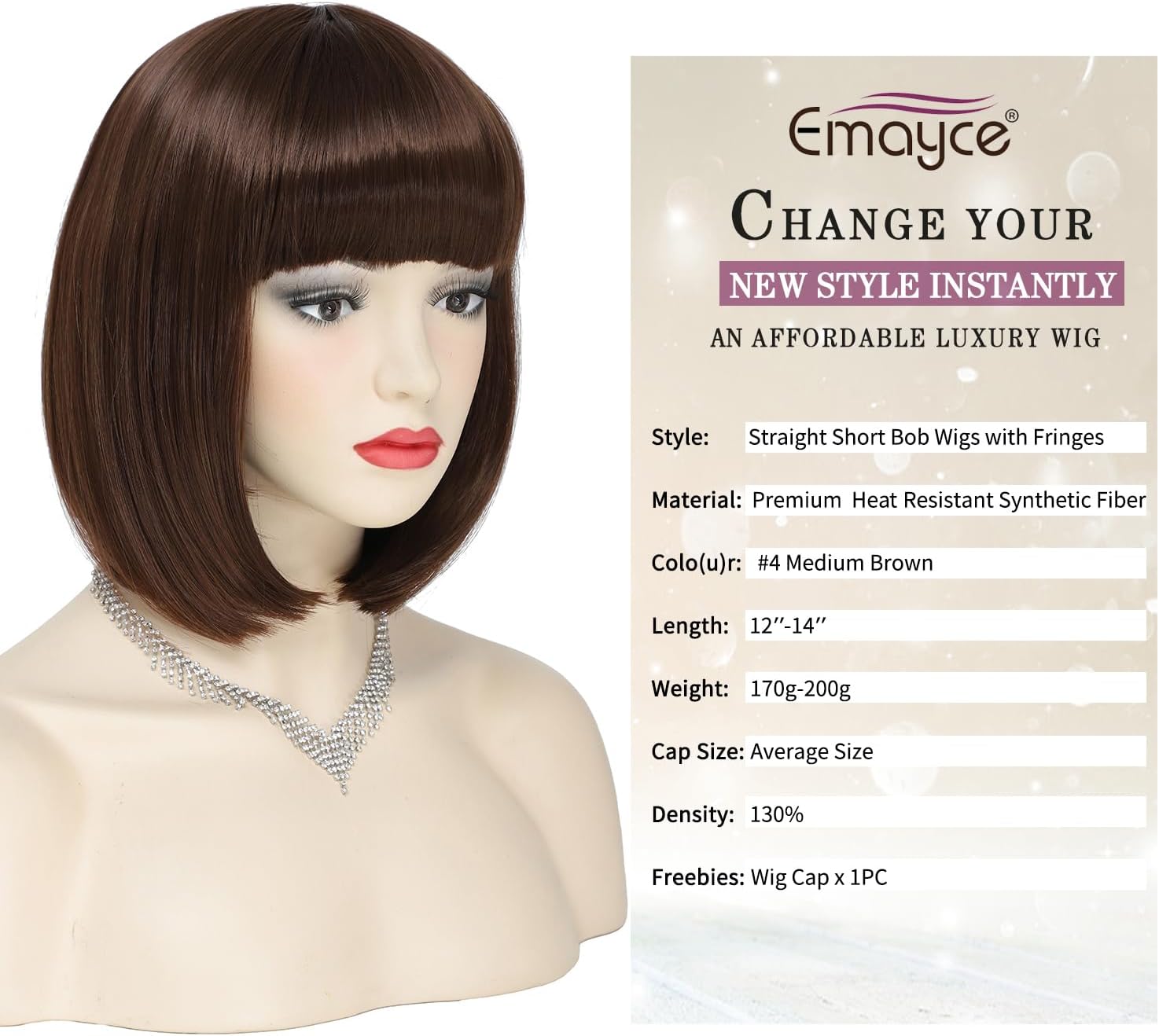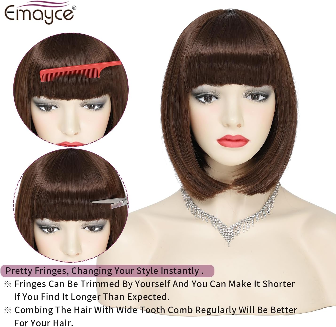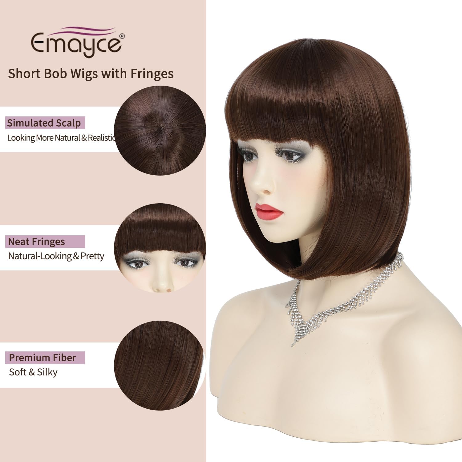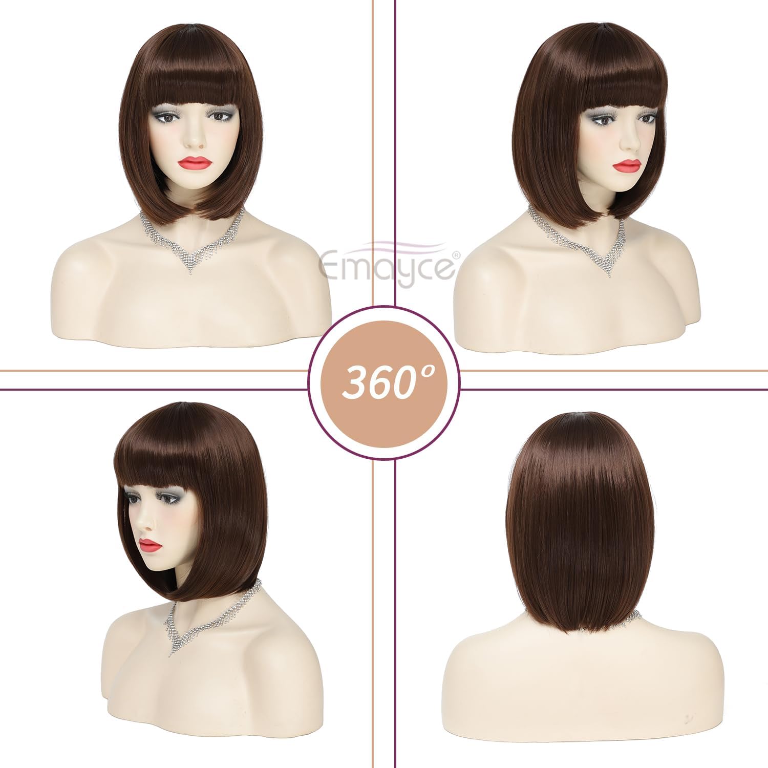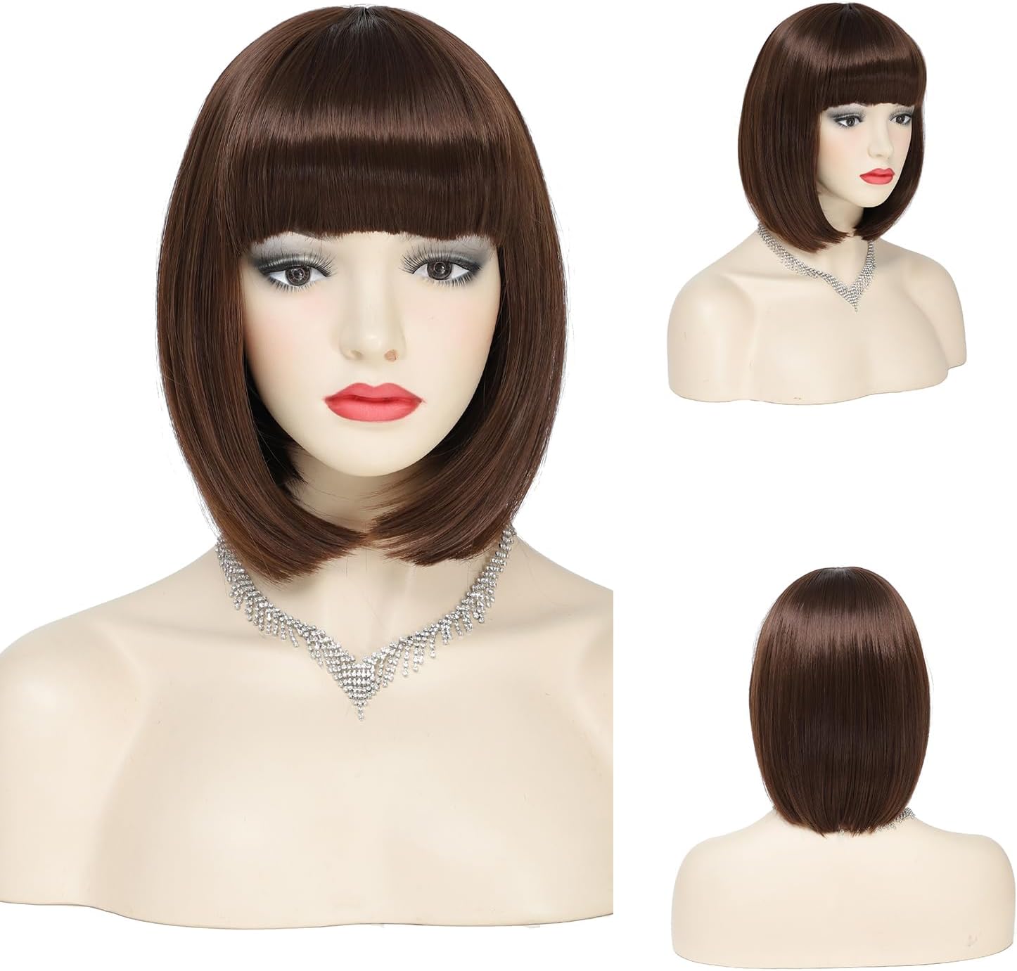 Short Bob Wigs with Fringes/Bangs for Women, Straight Brown Bob Style Wigs-Premium Heat Resistant Synthetic Fiber Layered Hair Wigs for Daily Party/Halloween/Cosplay (#4-Medium Brown)