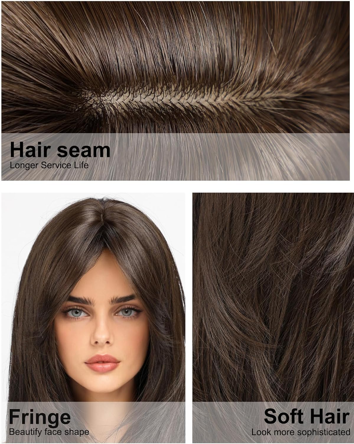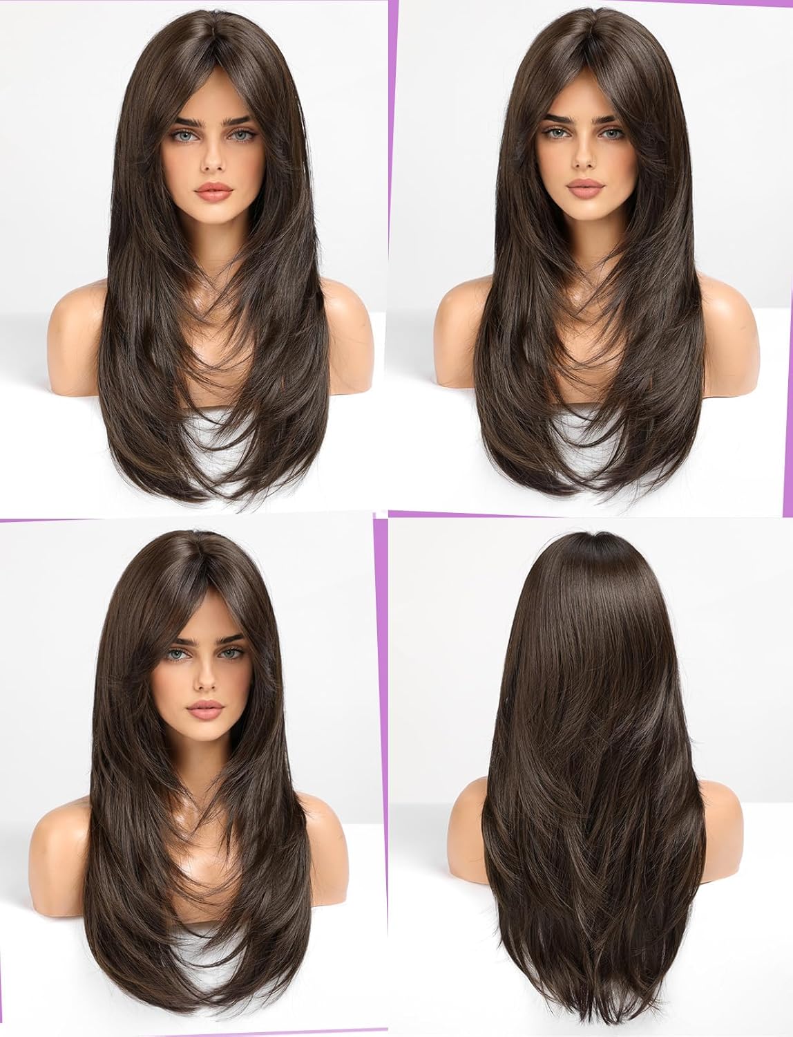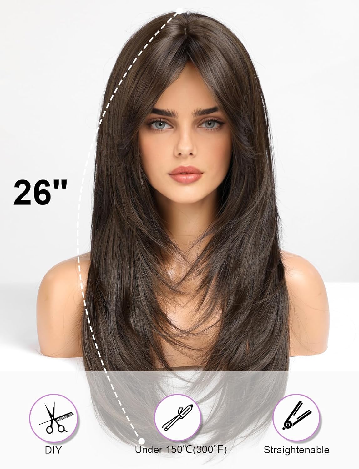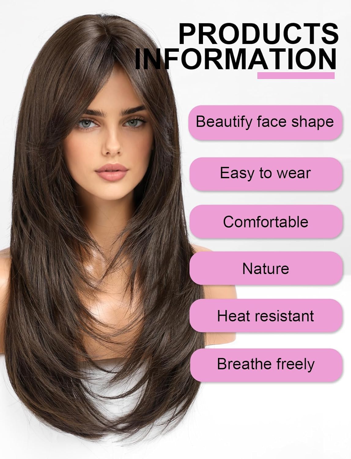 WOKESTAR Long Straight Wigs for Women with Curtain Fringe, Layered Synthetic Color Hair (Black Brown)
