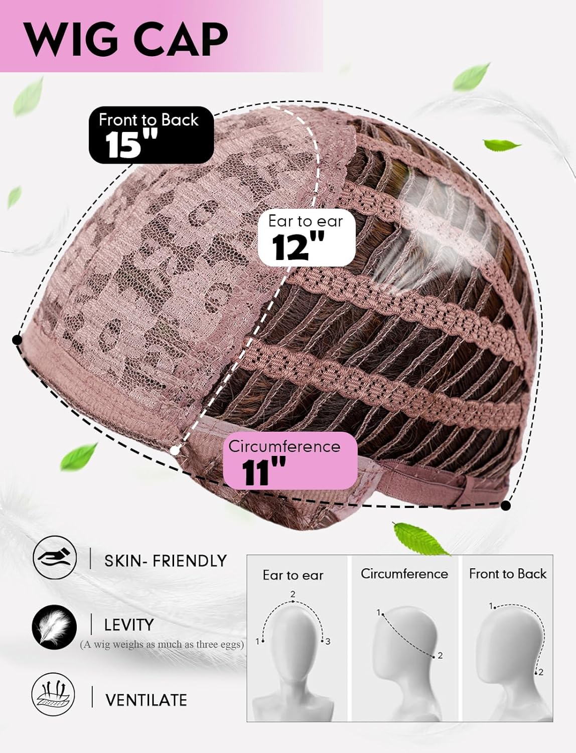 【Adjustable Cap】This wig is average cap size, about 21-23 inch with 2 adjustable straps. Breathable rose net will make you feel comfortable when you wear it