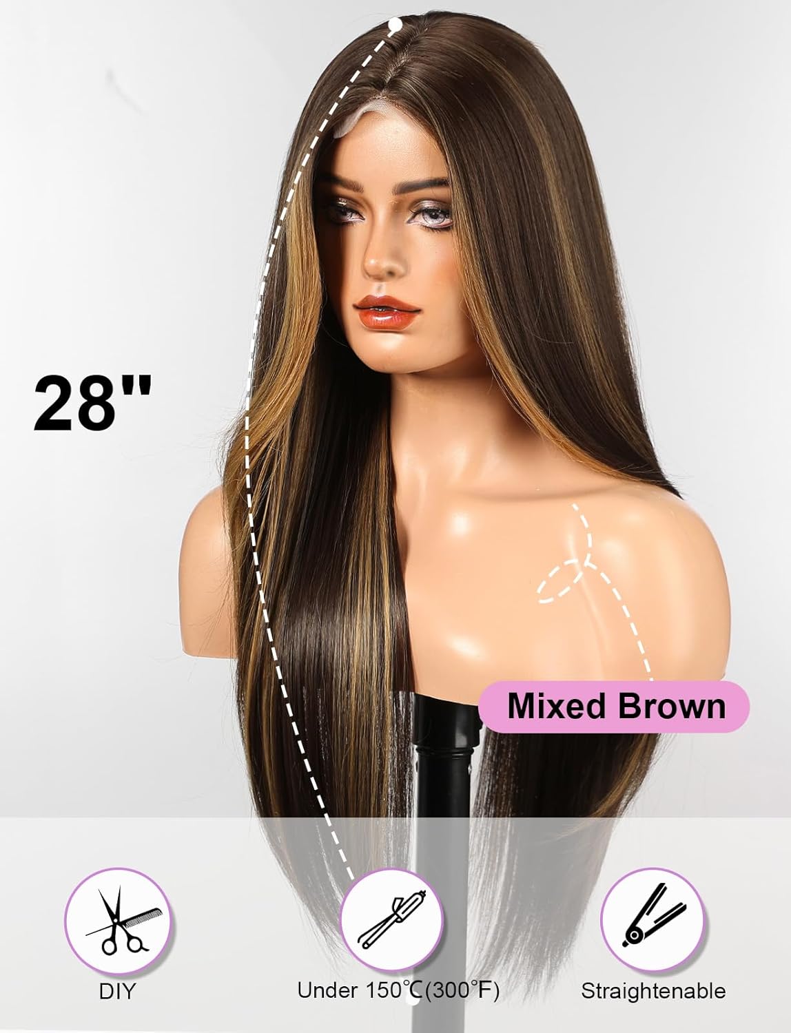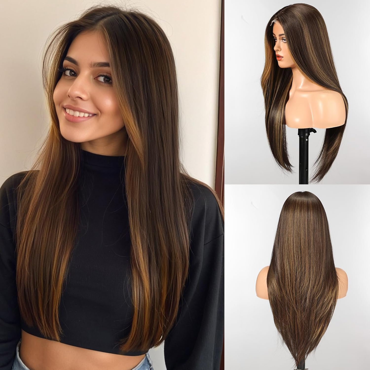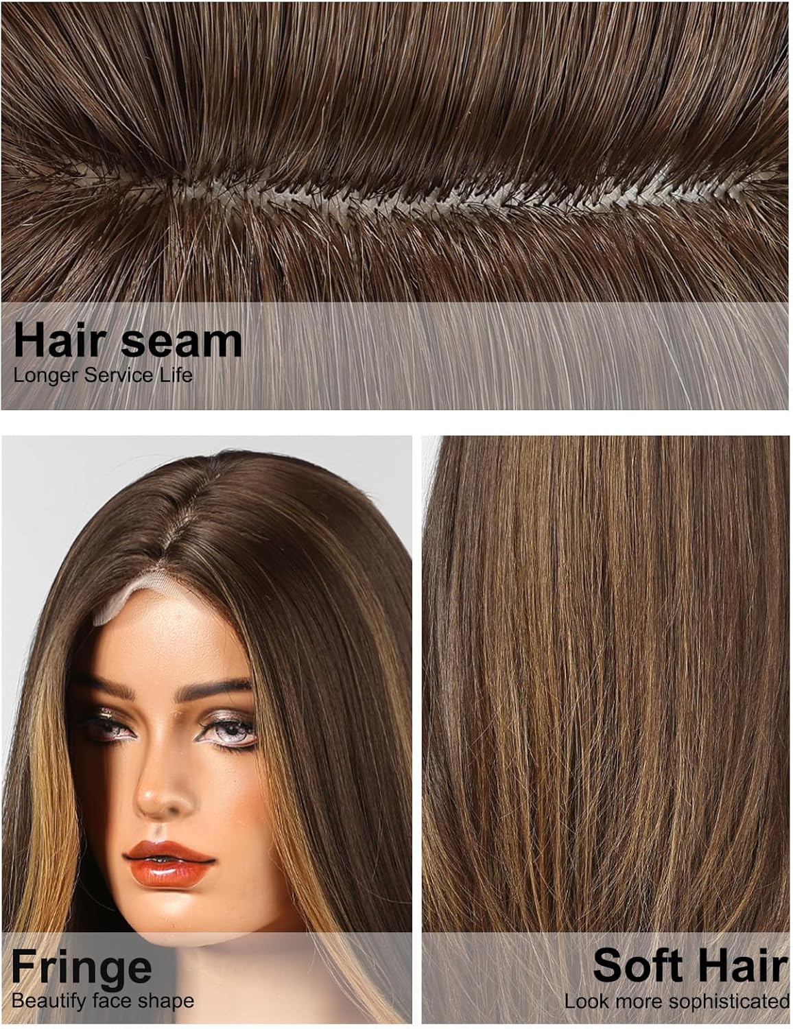 WOKESTAR Long Wigs for Women Synthetic Heat Resistant Hair with Fringe Natural Wigs for Daily Use Mixed Brown Color