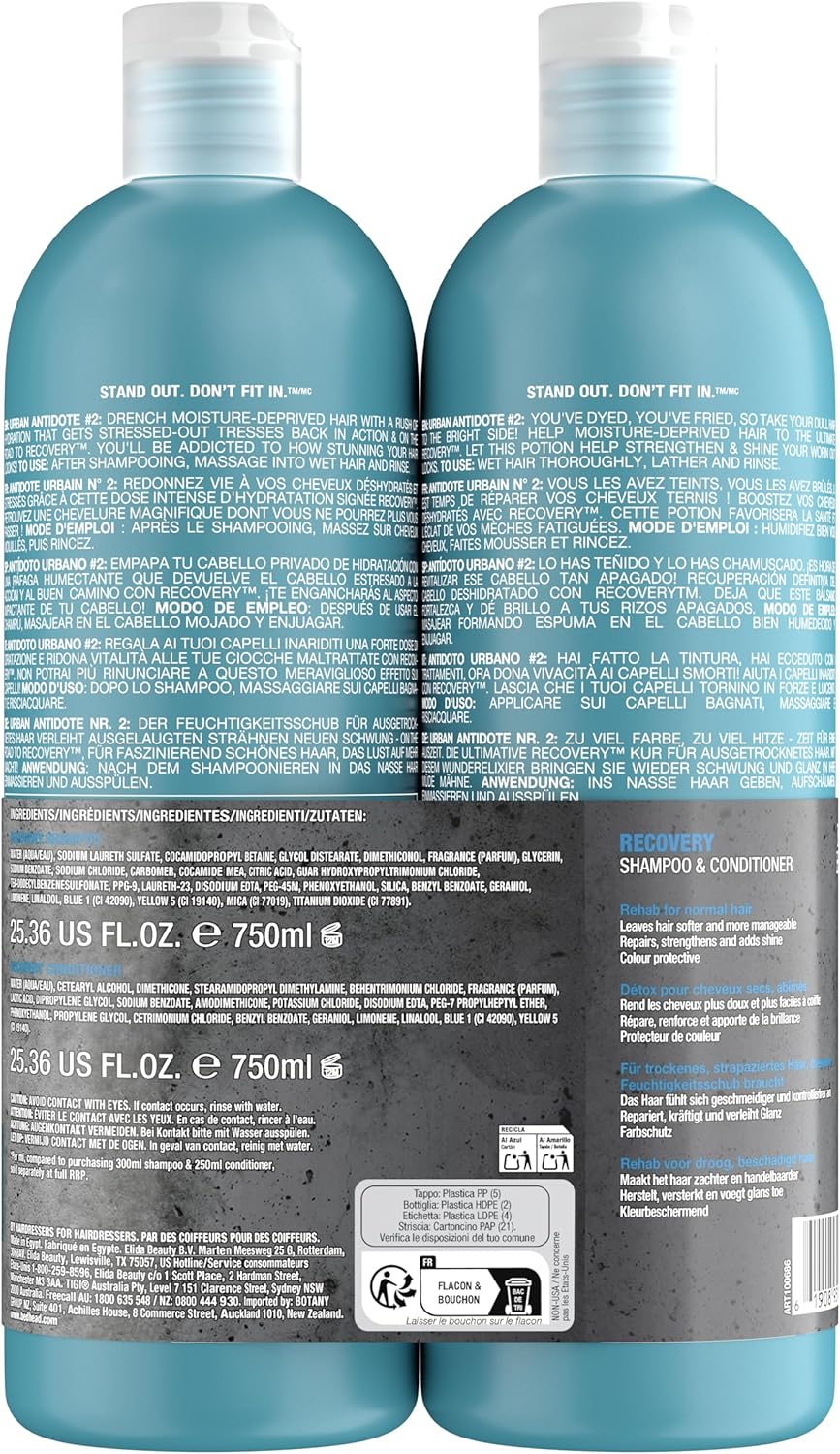 Bed Head by TIGI | Recovery Shampoo and Conditioner Set | Professional Moisturising Hair Repair Treatment | Ideal For Dry And Damaged Hair | 750 ml ( Pack of 2)