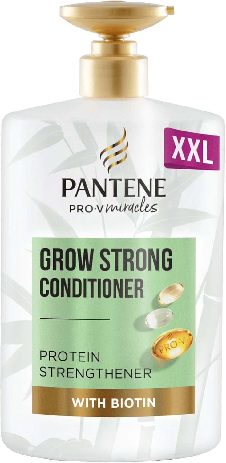 Pantene’s Grow Strong Conditioner is enriched with biotin, bamboo, and Pro-V blends. It promotes hair growth for longer and 100 Percent stronger hair, and helps reduce hair loss. Suitable for dry, damaged hair, as well as thin, fine hair. Use together with Grow Strong Shampoo for a complete hair care routine from the Pro-V Miracles collection for root to tip strength. The XL bottle contains one litre of conditioner and features a pump dispenser. strength against styling damage, vs. non-conditioning shampoo .hair fall due to breakage.