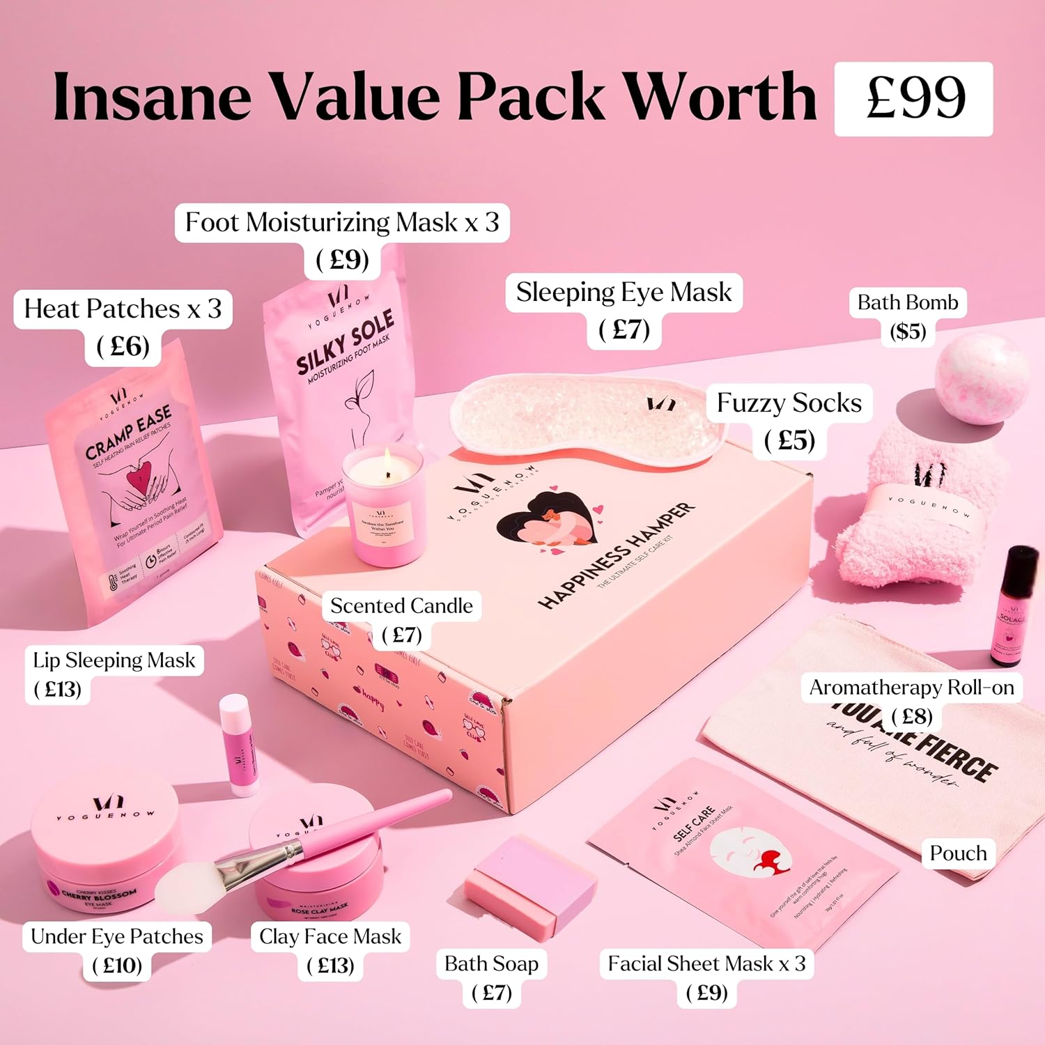 WHATS INCLUDED IN THE BOX?: This wholesome set consists of 22 skincare and self care items for women – 1 x Clay Mask with application brush, 1 x Under Patches, 1 x Lip Mask with Application Brush, 3 x Face Sheet Mask, 3 x Foot Mask, 1 x Pair of Fuzzy Socks, 3 x Self Heating Patches, 1 x Scented Candle, 1 x Bath Bomb, 1 x Soap, 1 x Aromatherapy Roll-on and 1 x Sleeping Eye Mask. It includes an adorable pouch and stickers too!
