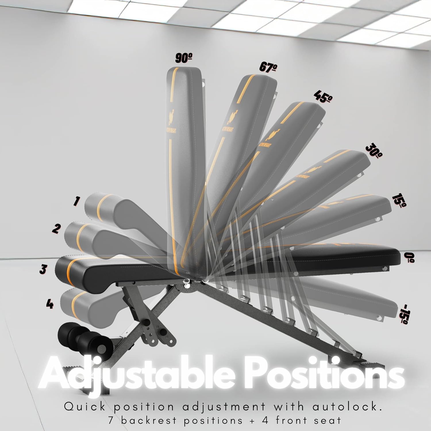 Adjustable in 11 positions: the Activeweight AW-0012 bench can be adjusted to the following 11 positions: tilt: 90°, 67°, 45°, 30°, 15°, flat: 0°, negative: -15°, the front seat can be adjusted in four positions.