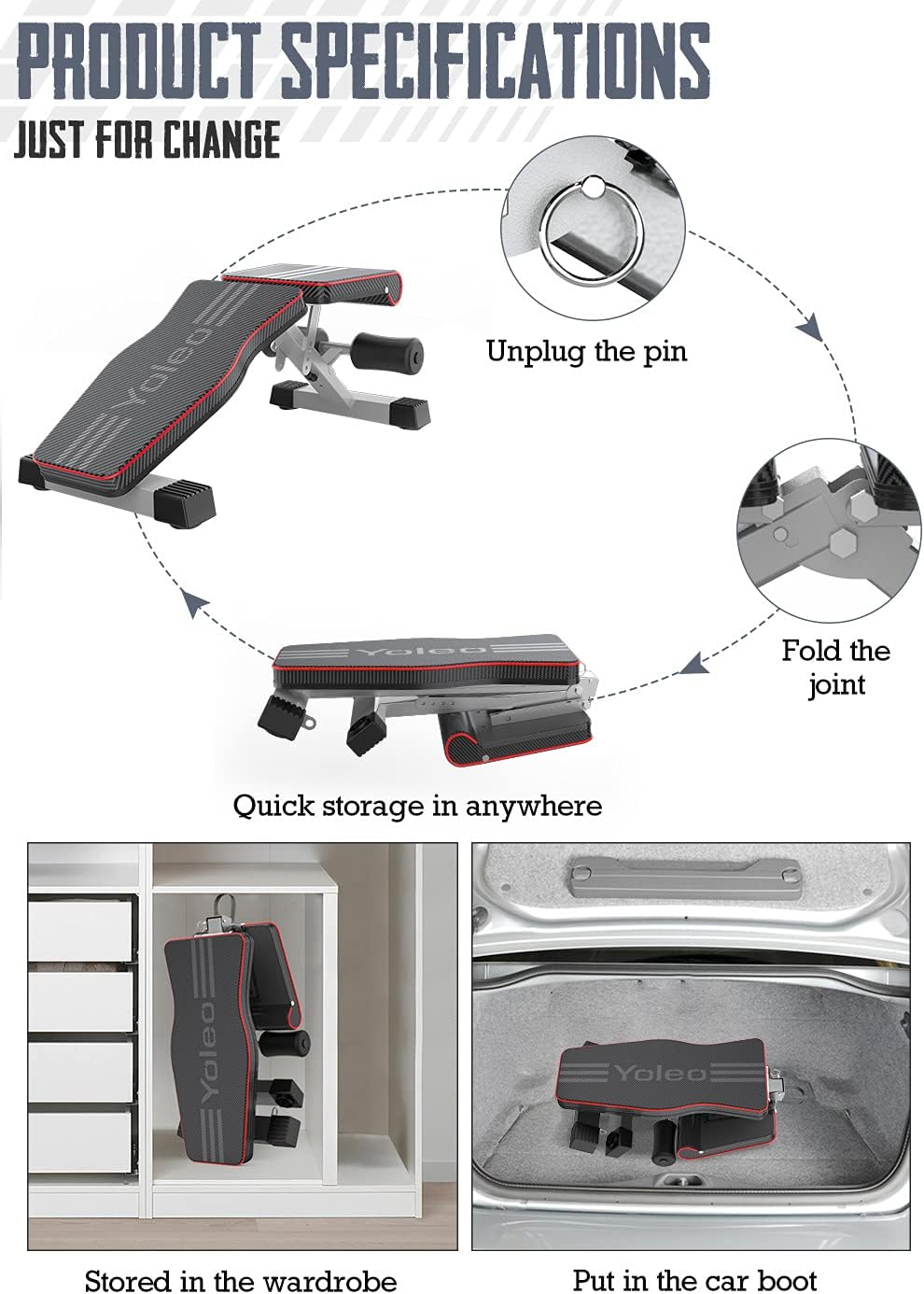 【SAVE 90% SPACE】 YOLEO foldable bench, easy to carry & NO ASSEMBLY NEEDED, folded size: 31.5″ L x 12.6″ W x 13″ H. You can put it in the corner or under the Bed when you finish workout