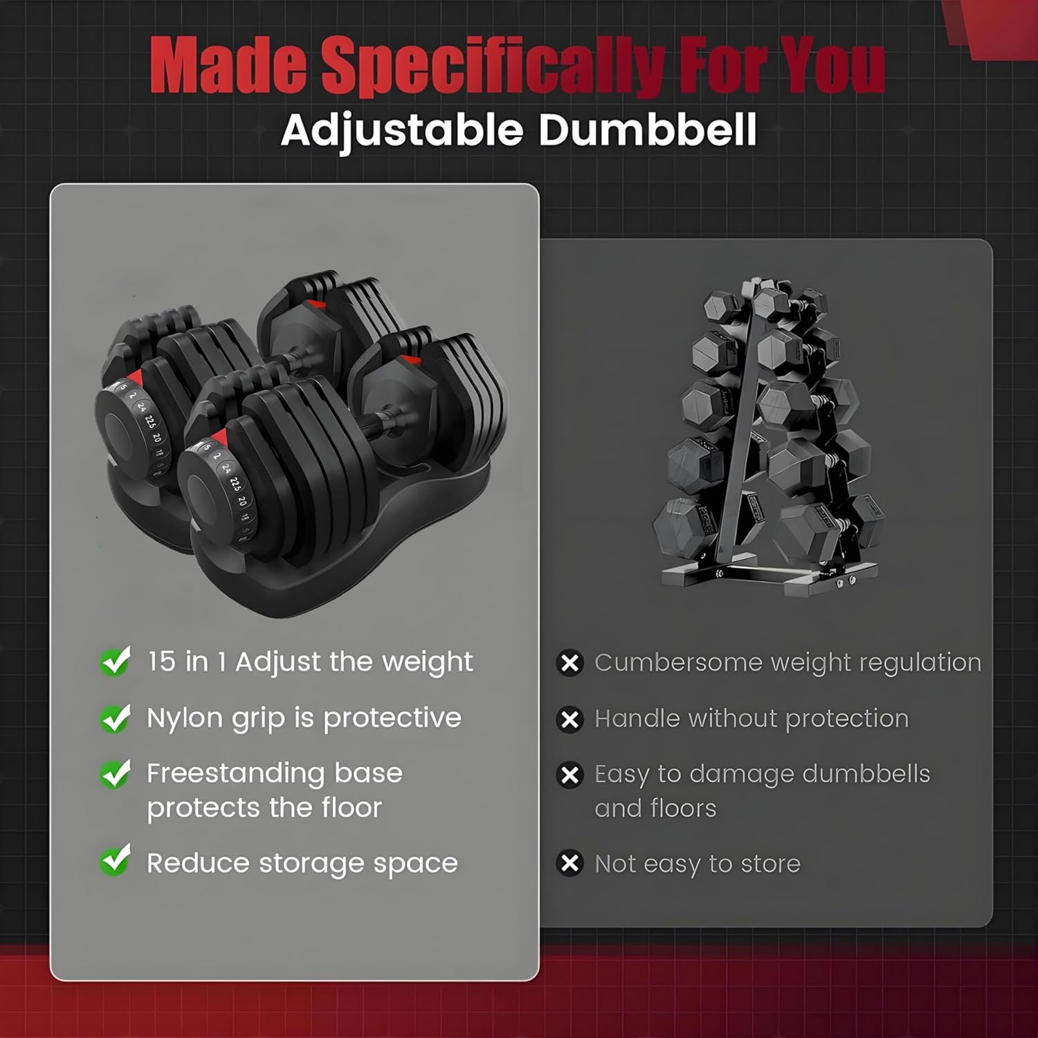 💪【Space saving Design】Each set of dumbbells has an exclusive high-density base to prevent the dumbbells from directly touching the ground. Not only protect the dumbbells, but also prevent hitting the floor.