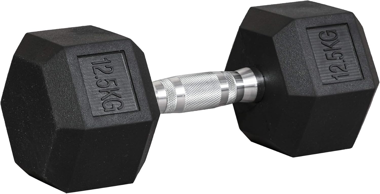 12.5kg weight: Medium-heavy weight, it’s made to be used by those who have been training and building themselves up to this level. Not for beginners. Hexagon shaped ends prevent weight rolling away.