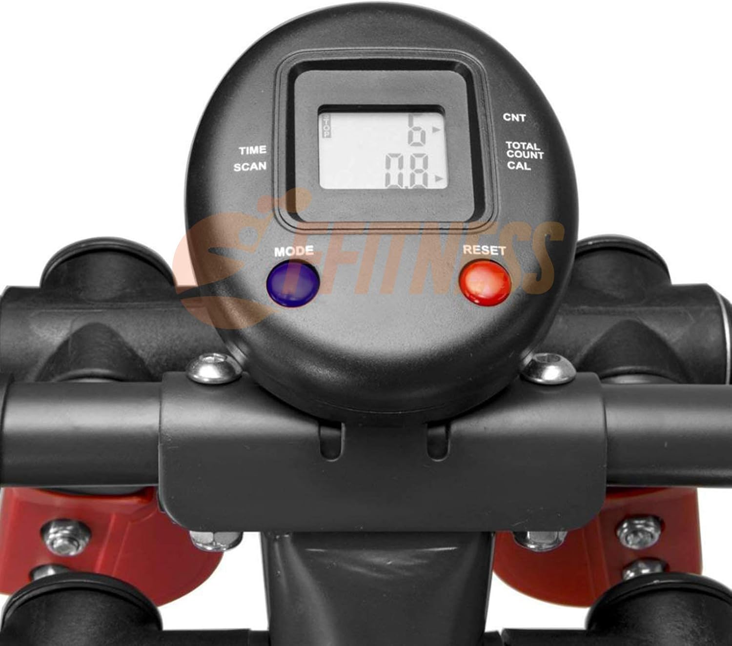 Rubber padded handles are sweat resistant. The training computer tracks steps, time spent and calories used. The tool is foldable and stores easily in any cabinet.