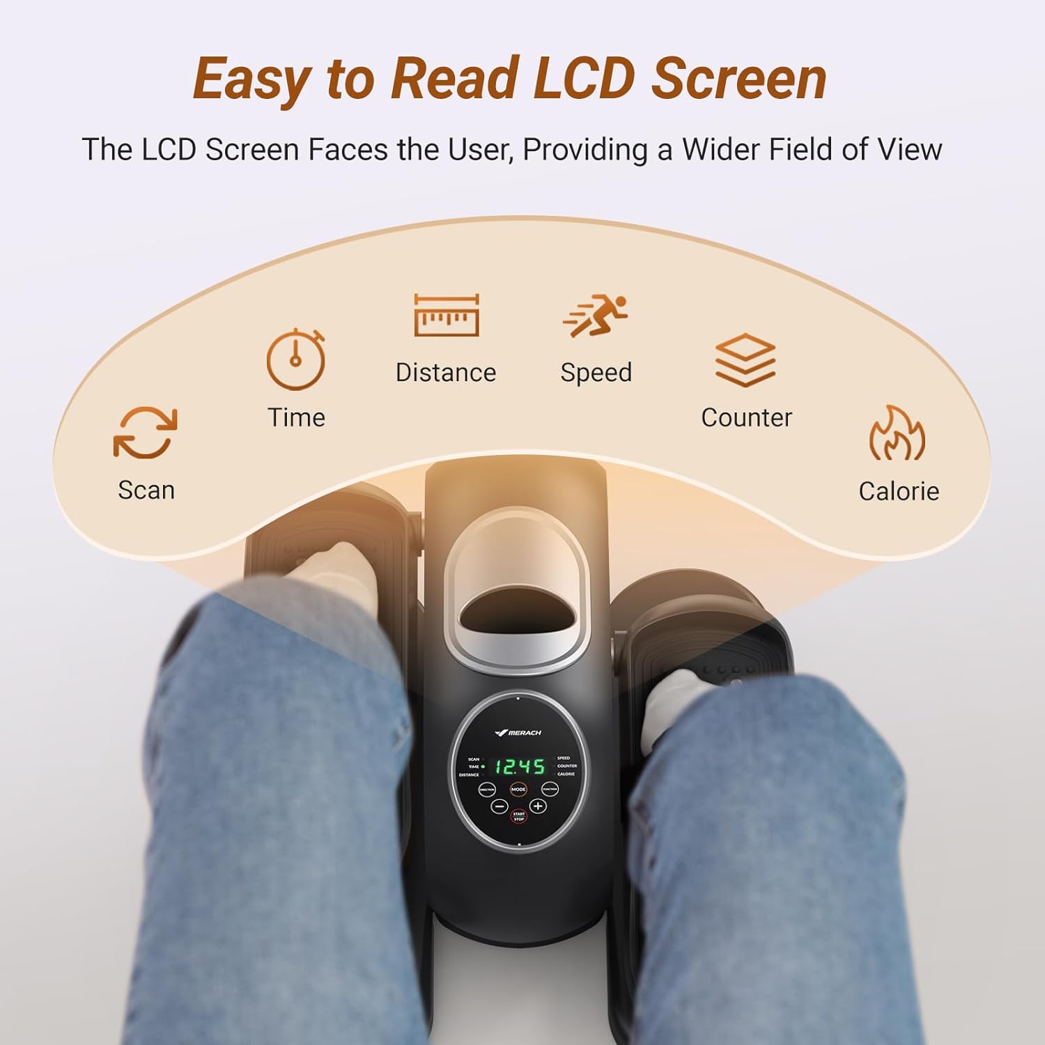 [Remote Control & Comprehensive Digital Monitor]: The Merach E32 leg exerciser includes a convenient remote control, enabling easy adjustments without the need to bend over, protecting your waist and back. The user-facing LCD monitor clearly displays essential workout data, including time, distance, speed, calories, and count.