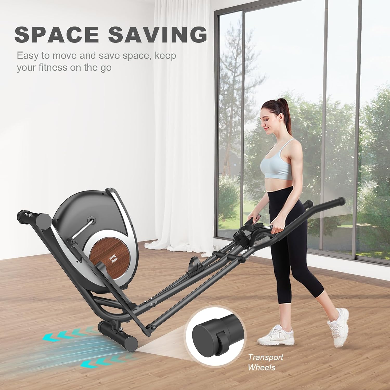 【Space-Saving Design】With its compact design, this elliptical trainer can be placed in any corner of your home. The transport wheels make it easy to move the machine to any space in your home, apartment, or gym, allowing you to start working out wherever you prefer.