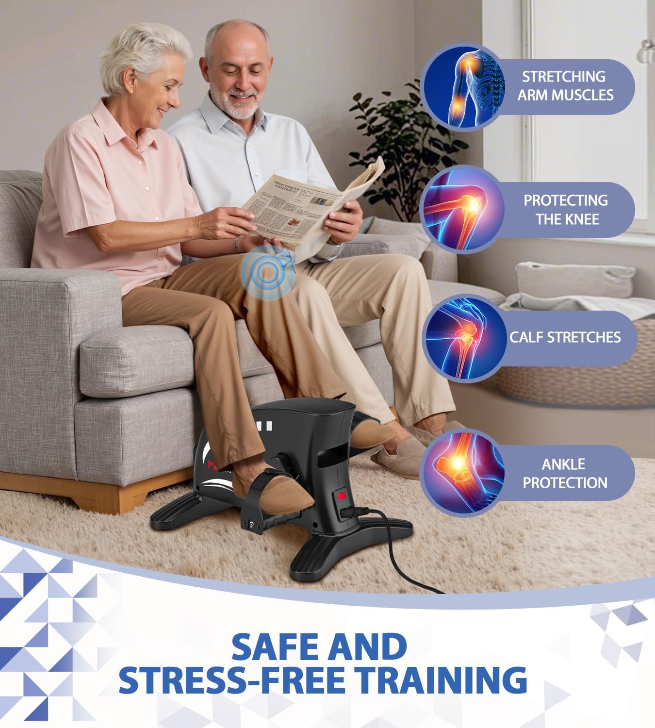 【Electric & Manual 2-IN-1】: The pedal exerciser offers a dynamic workout experience with two modes. Operate in Active Mode without plugging in, using your leg strength for a manual workout, or switch to Passive Mode when plugged in to control speed and direction via the remote for a versatile exercise experience. Targeting different muscle groups as well as ligaments for a complete workout. A perfect exercise equipment for home use!