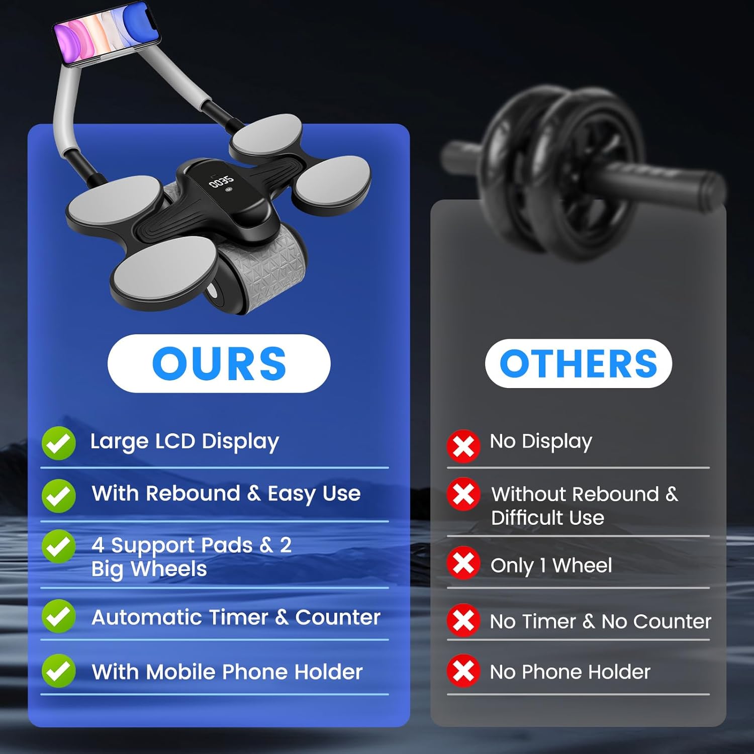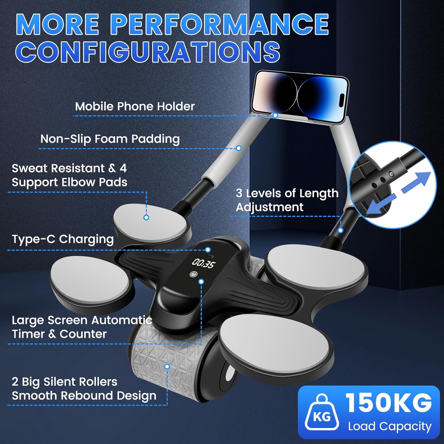 【Great Gym Equipment】Exercise roller wheel includes a built-in mobile phone holder, allowing you to enjoy your favorite music while working out. This combination of fitness and entertainment makes your exercise sessions more enjoyable and motivating. The integrated full LCD display screen and Type-C charging port offer enhanced convenience and user experience.