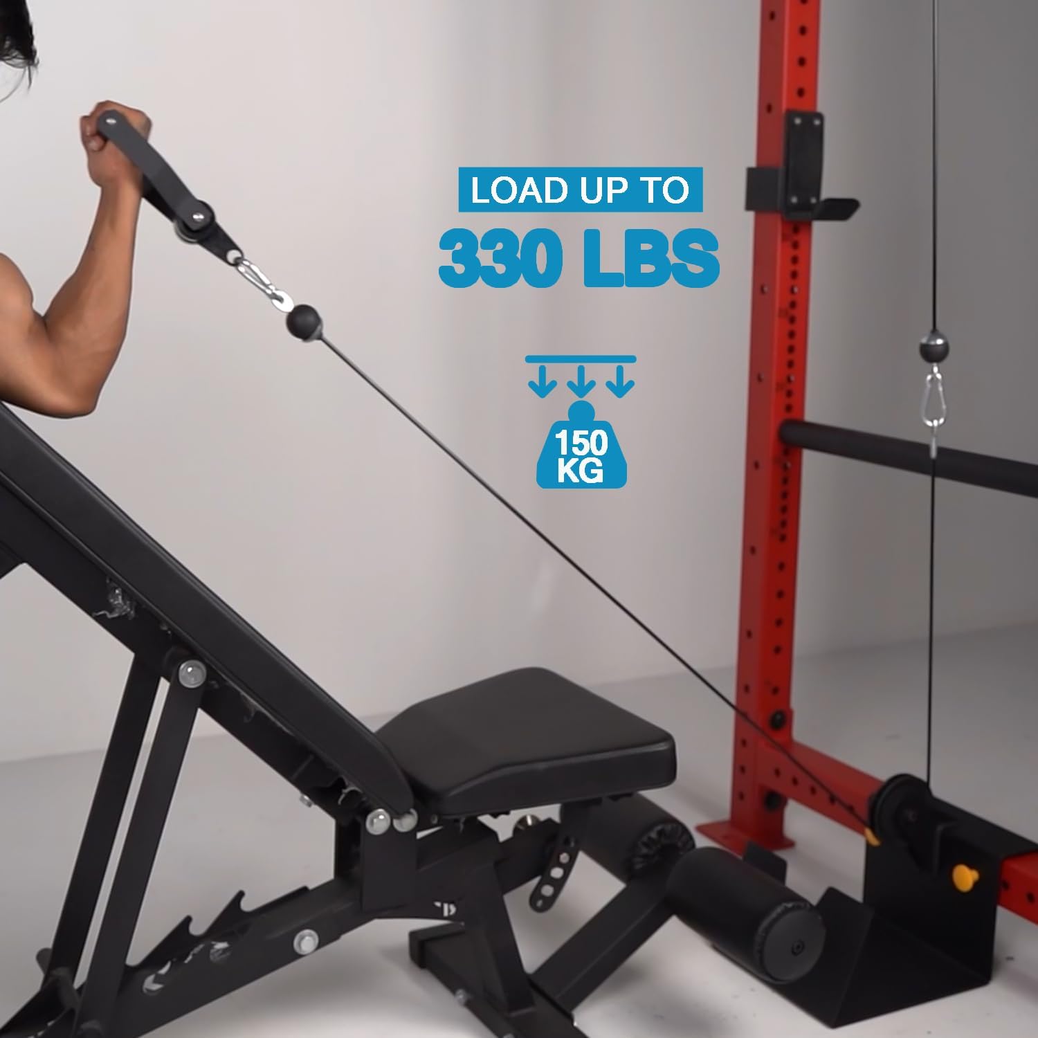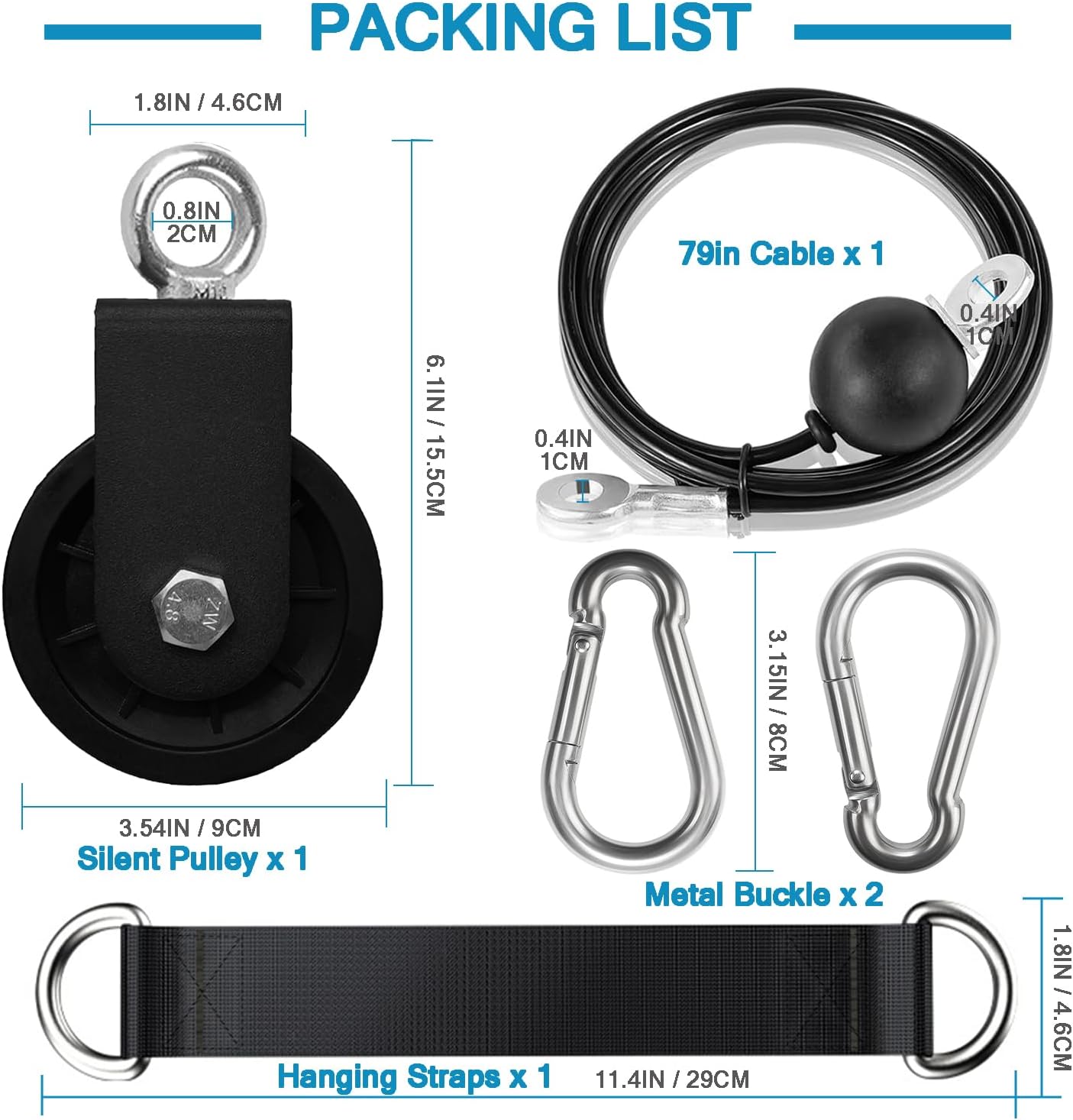 PACKAGE AND AFTER-SALES – Pulley x 1,Hanging Straps x 1,Buckle x 2,Cable x 1.Maximum weight capacity:330 LBS,we recommends that all equipment be secured to a solid,level surface to stabilize it and eliminate rocking or tipping over,replace them at the first sign of wear.If you have any questions,please feel free to contact us.