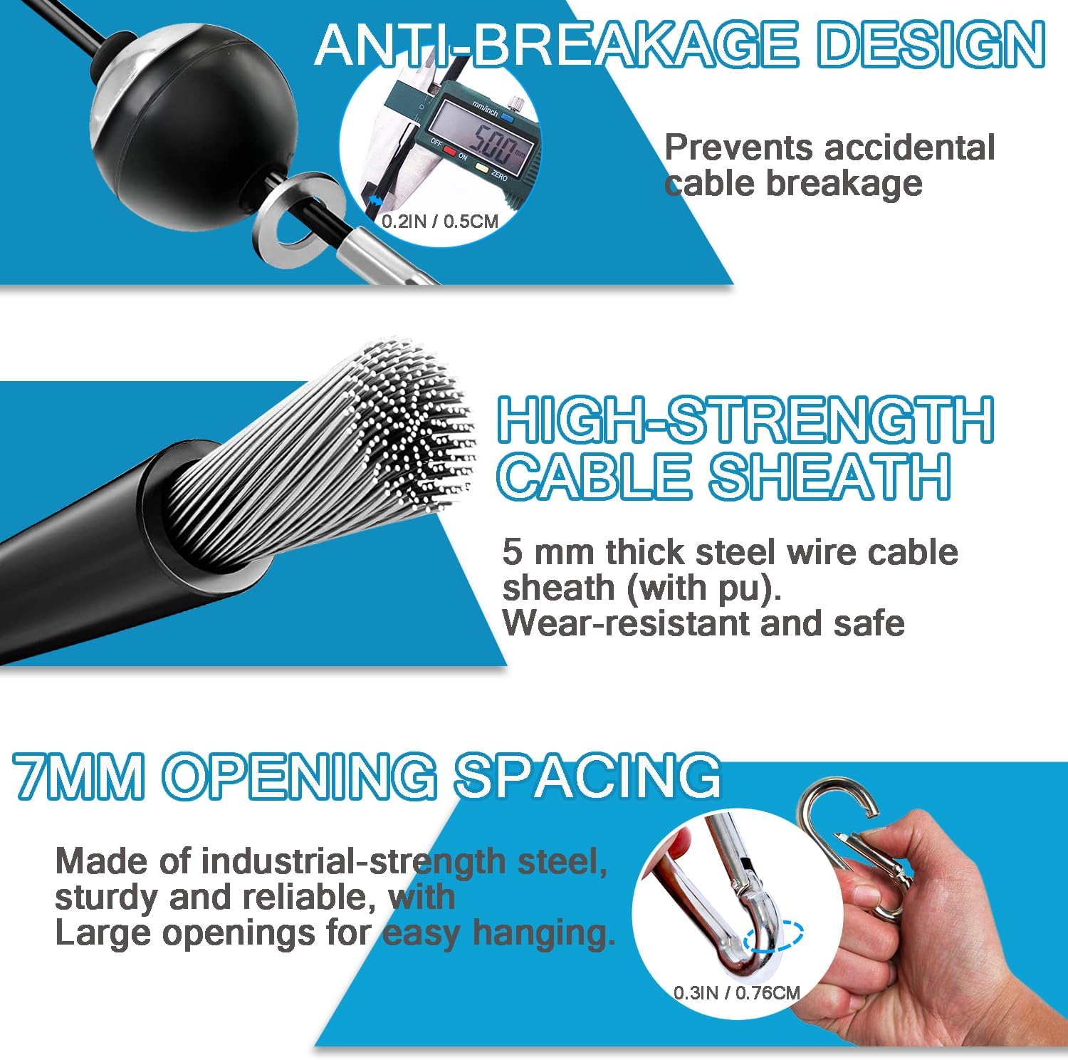 SAFETY DESIGN – Professional cable machine replacement cable with a stopper ball and wire is consists of 7 shares, 19 wires per share.The ball prevent the cable shakes,the metal sheets prevent the rubber stopper ball to hit the pulley during use it,which makes it safer and more stable.