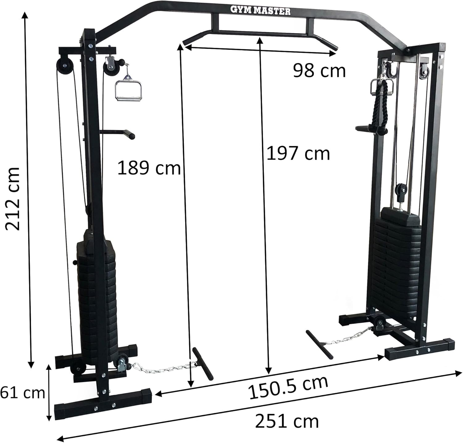 Assembled Dimensions: 251cm (W) x 61cm (D) x 212cm (H). Pulldown Bar Load Capacity: 200kg. Please Note: At least the first two weights per tower need to be selected before use. Not Suitable for Commercial Use.