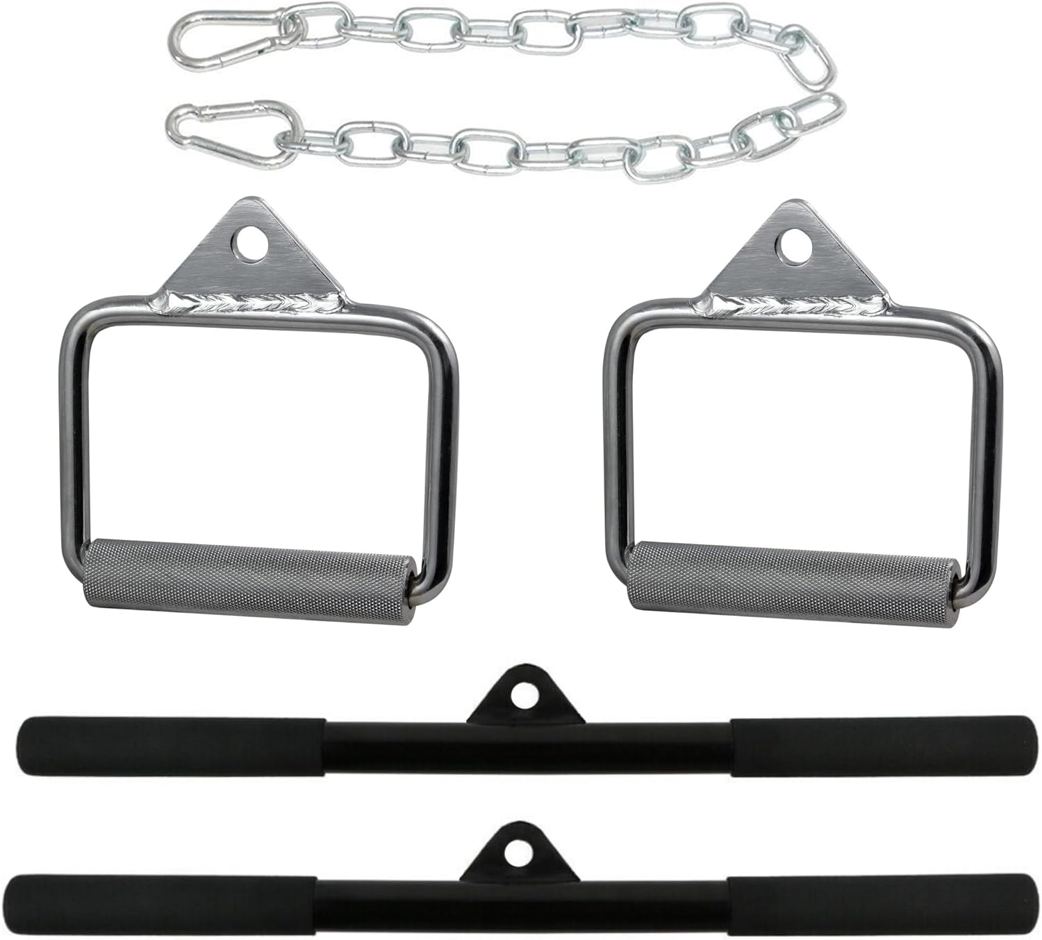 180kg Total Weight – 90kg Per Side. Includes 2 Straight Bar Handles, 2 Steel Chains & 2 Chrome Stirrup Handles, As Well As a Tricep Rope