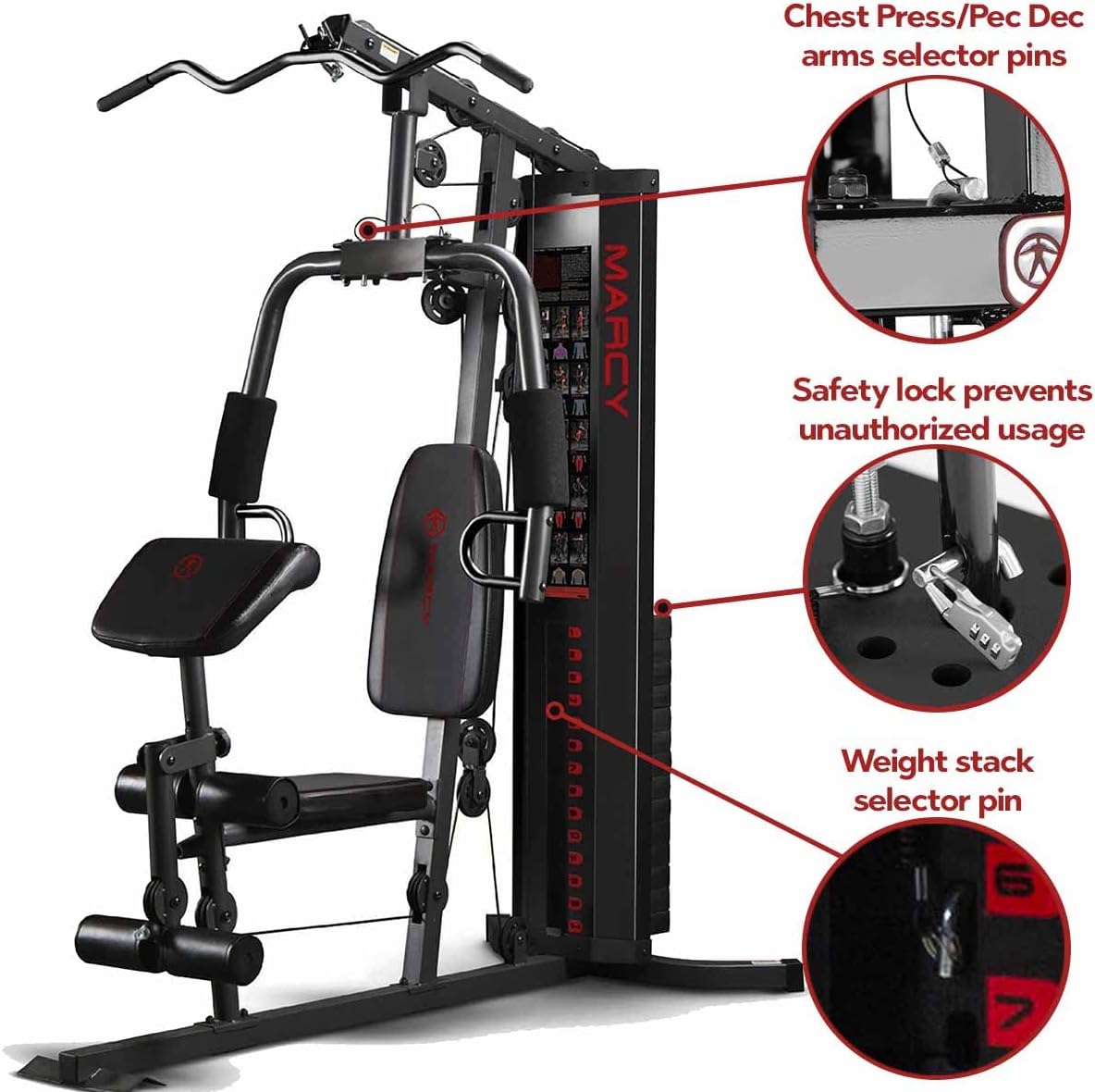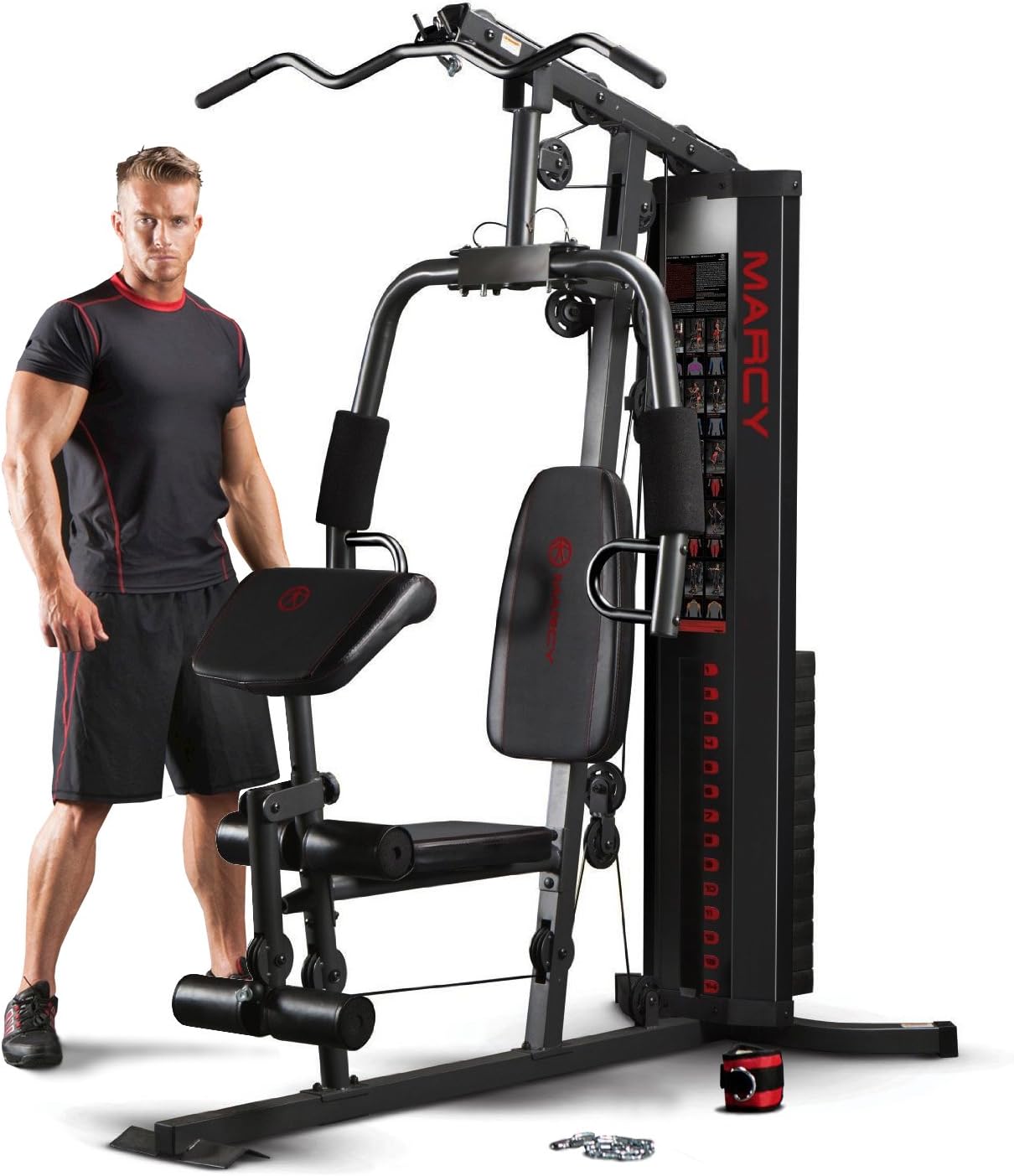 The Marcy Eclipse HG3000 is a compact home gym, it doesn’t dominate your entire room, but it still maintains a robust, durable feel with all of the essential training features. Both the high and low pulleys can use any of the gym attachments included, the high pulley is perfect for Lat. pulldown, triceps pushdowns and ab crunch with the low pulley better suited for seated rows, bicep curls and upright rows.