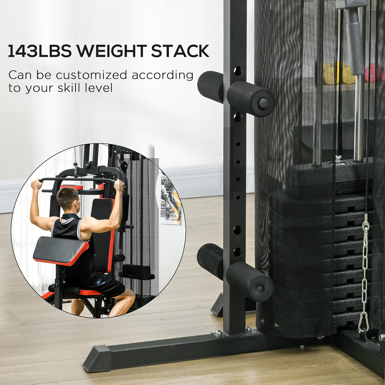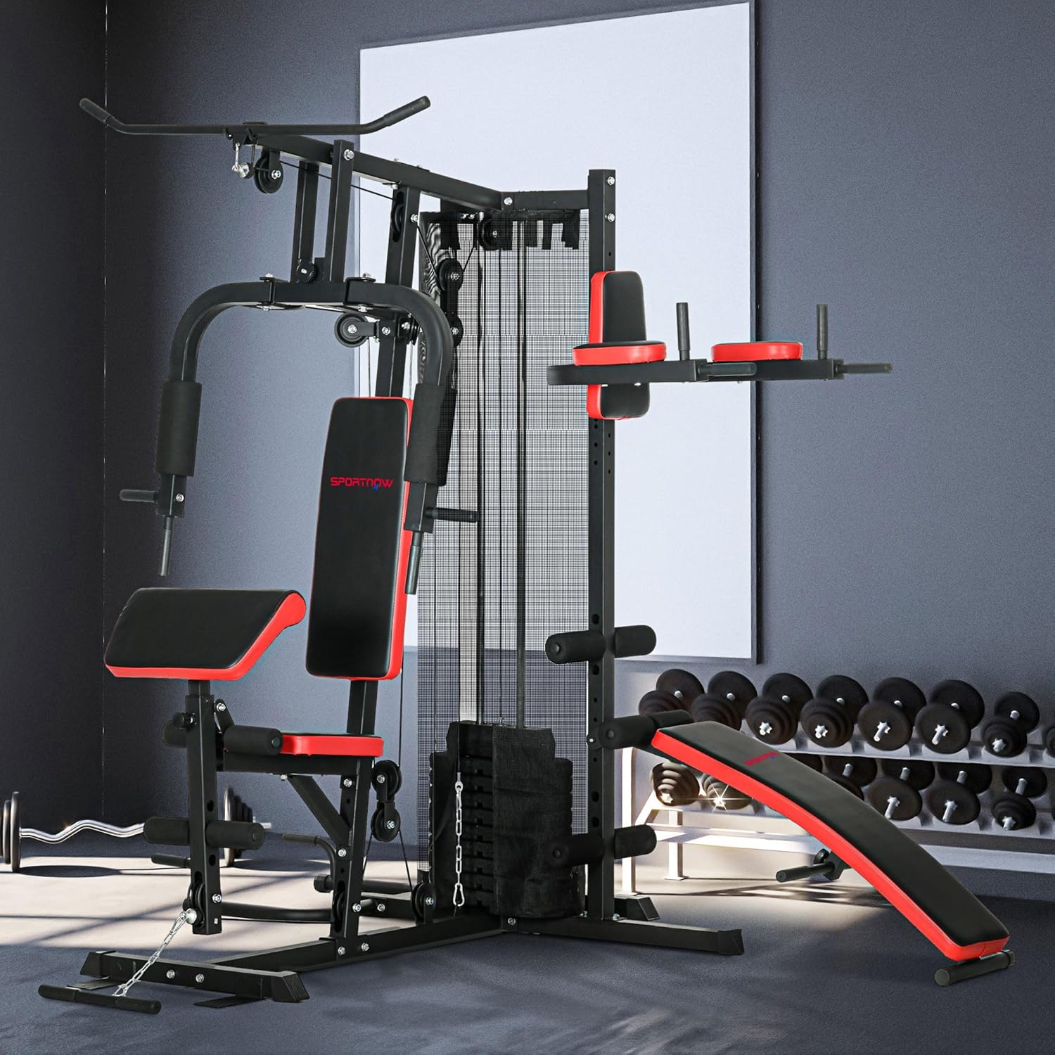 Adjustable comfort: This home multi gym boasts a height-adjustable arm curl pad and elbow pads to suit various body sizes, plus a sit-up bench with four height settings for optimal exercise alignment.