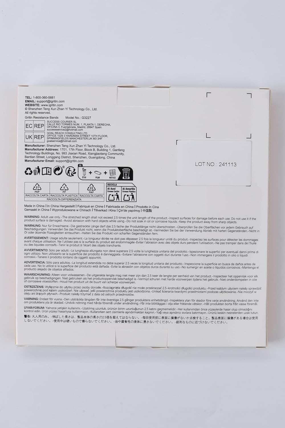 【What You Get】5X Gritin resistance bands with different level , 1X portable storage bag and 1x Manual in six languages.