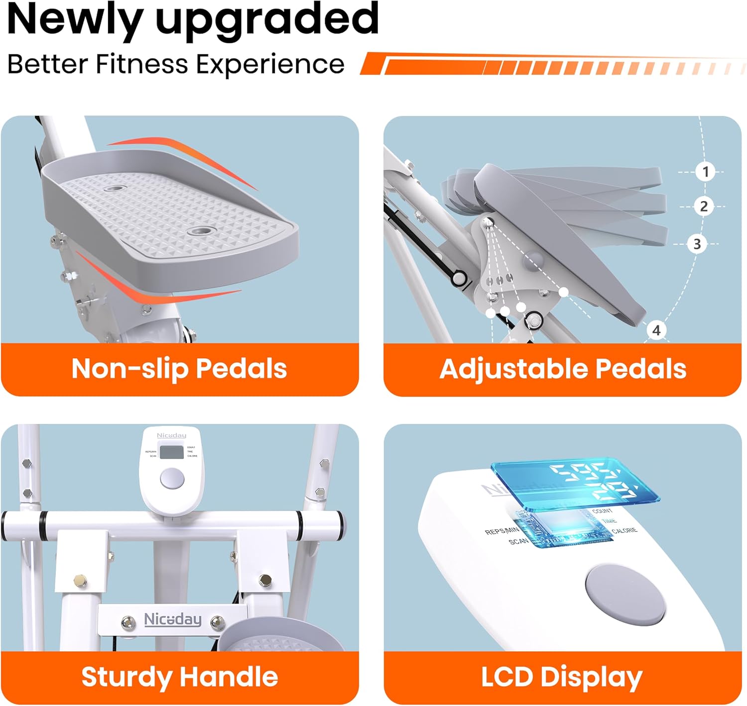 【Real-Time Data Tracking】The Niceday stepper’s LCD monitor tracks four key data: steps, calories, time, speed, and scan. You can easily record and view your workout progress.