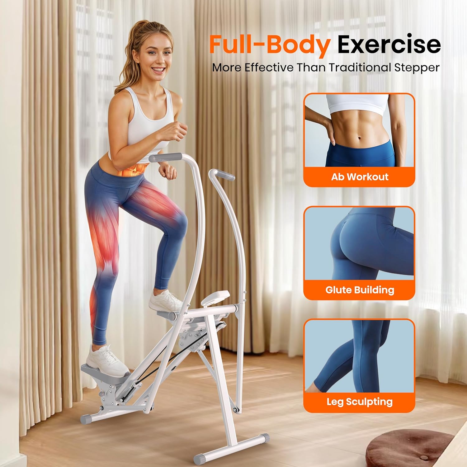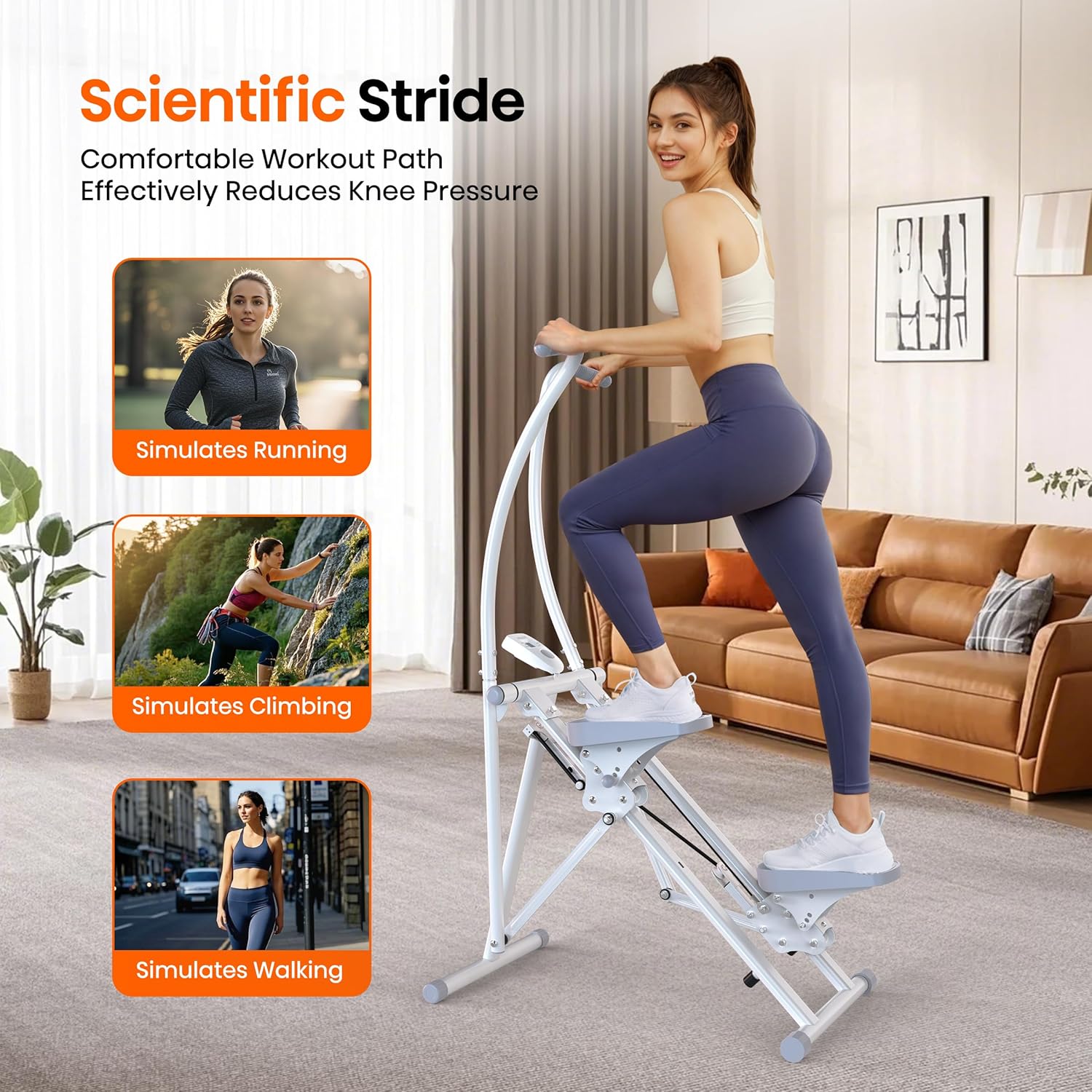 【Gentle on Your Knees】The generous 18-inch stride length provides full leg extension. At the same time, the ultra-smooth 45° incline motion ensures you get the optimal climbing experience with minimal knee pressure, offering a safe and comfortable workout.