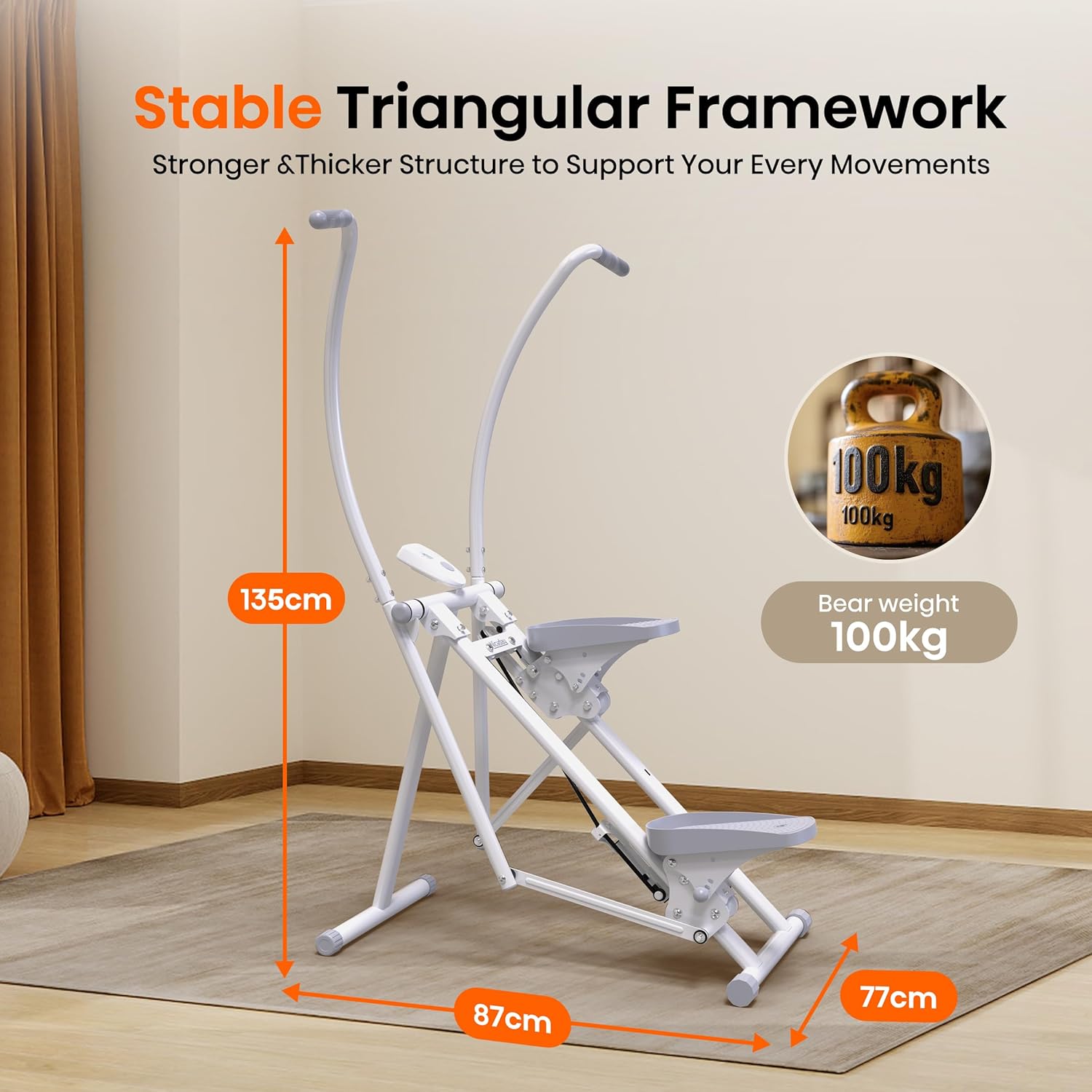【Reliable Stability with 100KG Capacity】 The 5CM elliptical commercial-grade steel frame provides a reliable 300 LBS weight capacity. The dual-triangle structure ensures stability during high-intensity workouts, eliminating concerns about wobbling.