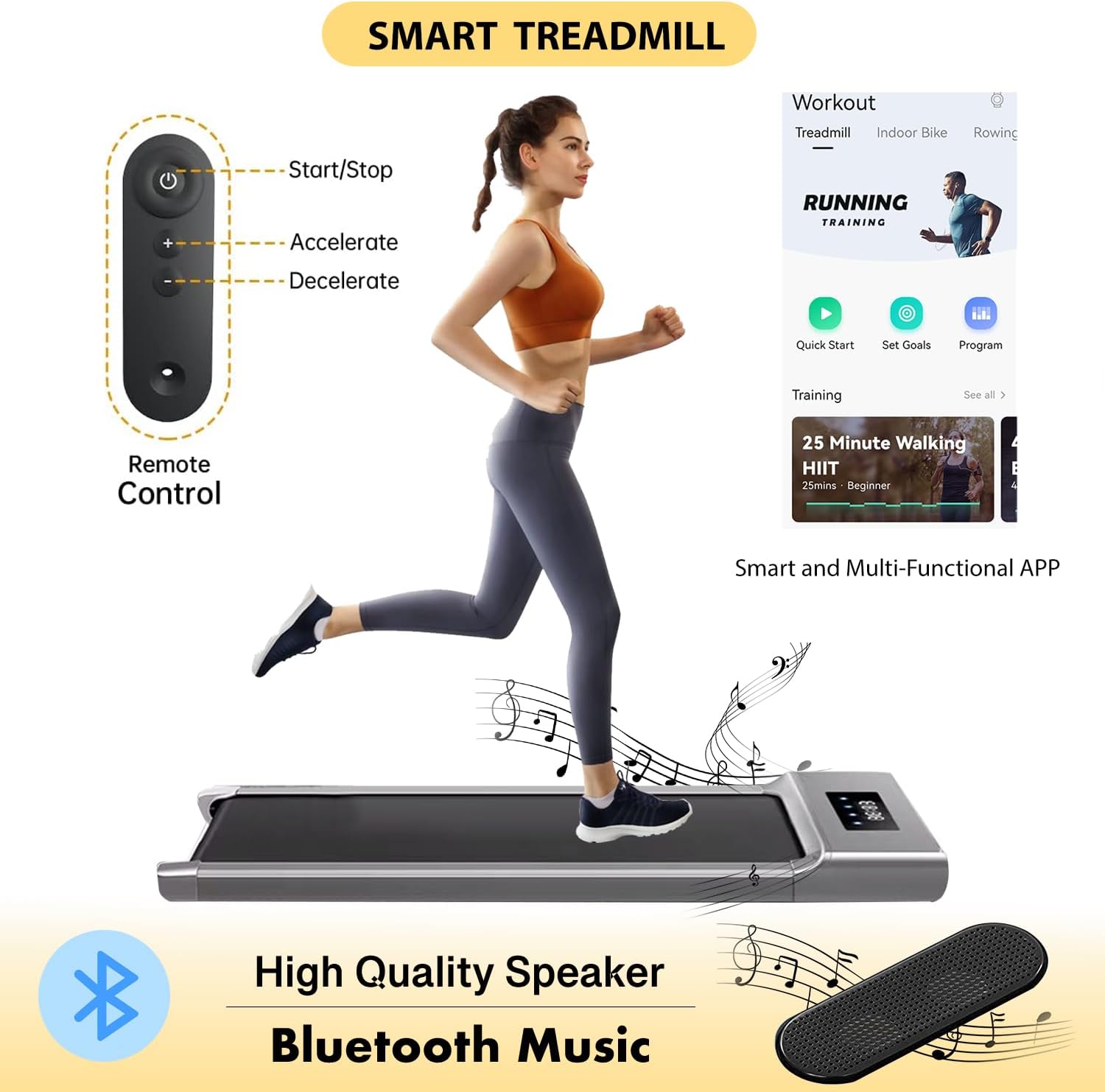 BLUETOOTH SPEAKER & REMOTE CONTROL – Connect the under desk treadmill to your phone via Bluetooth, so you can listen to your music with others while you are exercising. The remote control is convenient to adjust the running speed, mode and program.