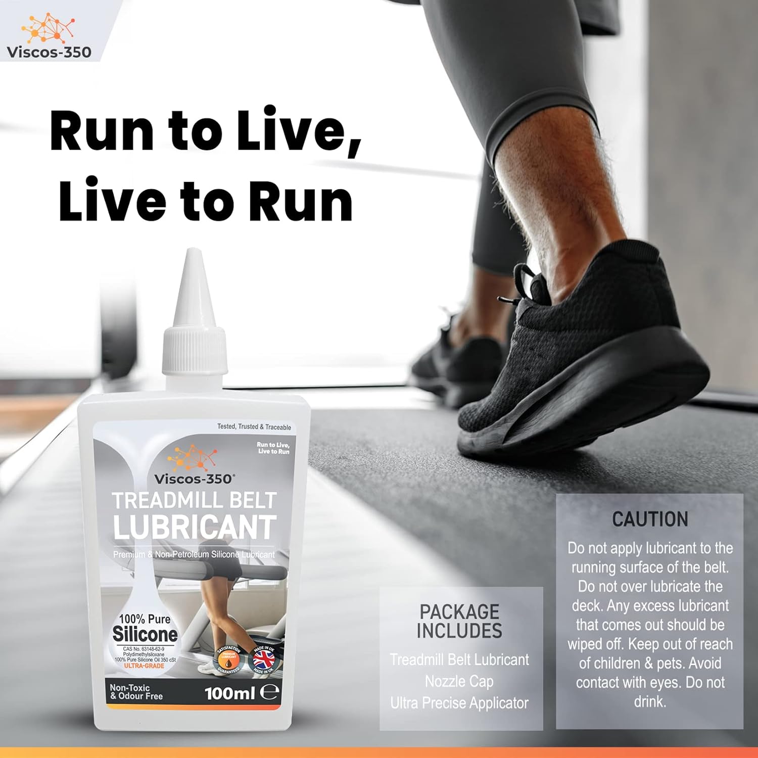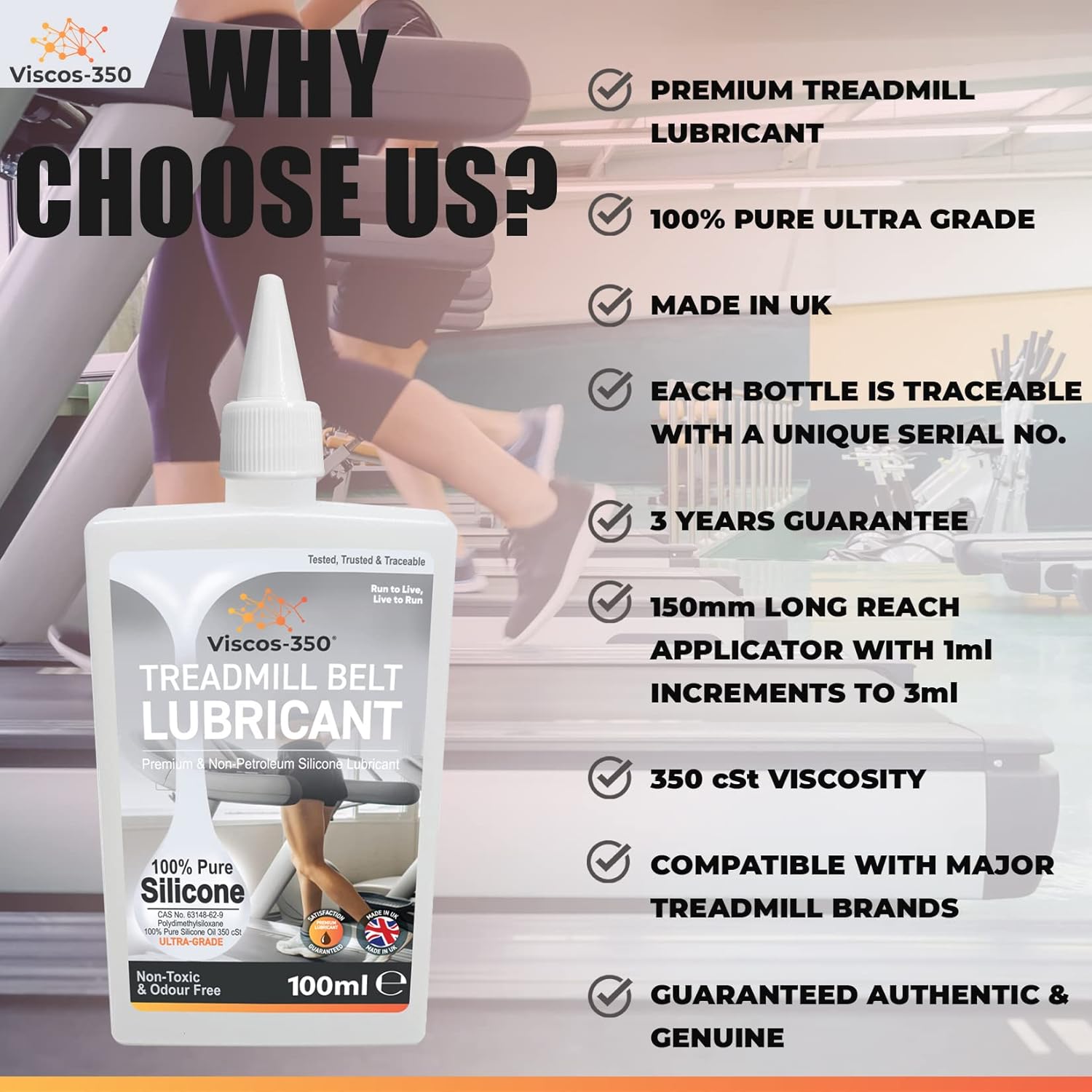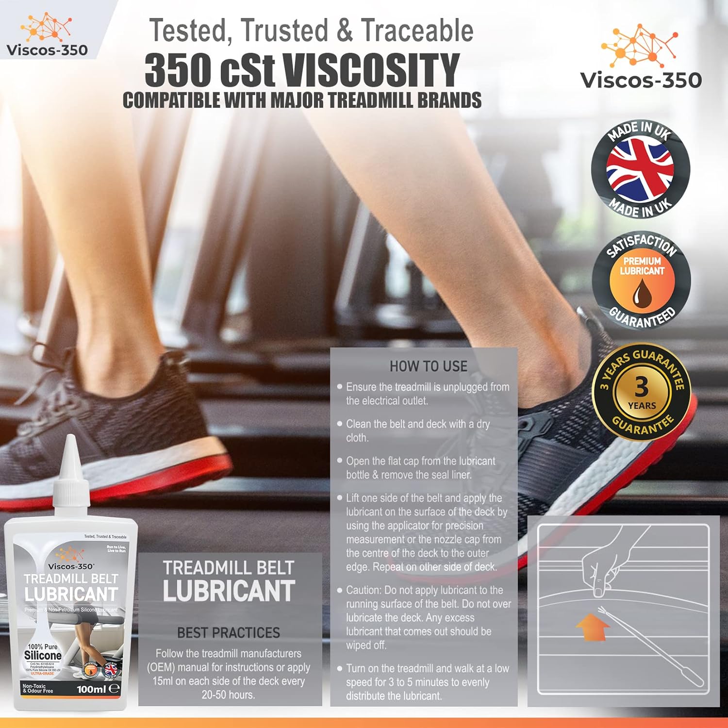 OUR PROMISE: Each Viscos-350 bottle of silicone oil for the treadmill is manufactured in the UK with its own unique Serial No and is traceable to a production batch. Every bottle undergoes extensive quality control and comes with a Certificate of Authenticity No. However, if you’re not so pleased, we’ll offer a 100% prompt and courteous refund. For any questions about your treadmill belt lubricant, our customer care team is available. 100% satisfaction guaranteed.