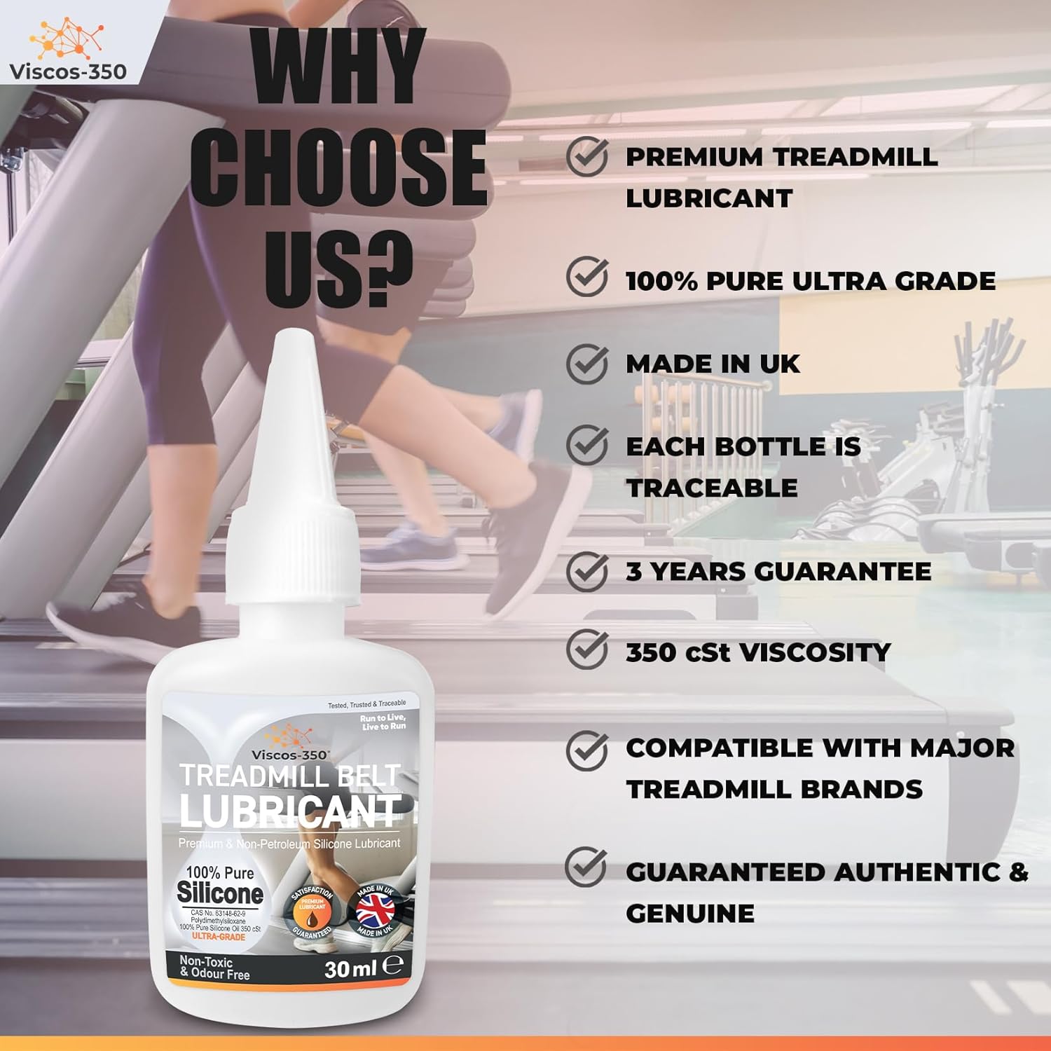 OUR PROMISE: Each Viscos-350 bottle of silicone oil for the treadmill is manufactured in the UK with its own unique Serial No and is traceable to a production batch. Every bottle undergoes extensive quality control and comes with a Certificate of Authenticity No. However, if you’re not so pleased, we’ll offer a 100% prompt and courteous refund. For any questions about your treadmill belt lubricant, our customer care team is available. 100% satisfaction guaranteed.