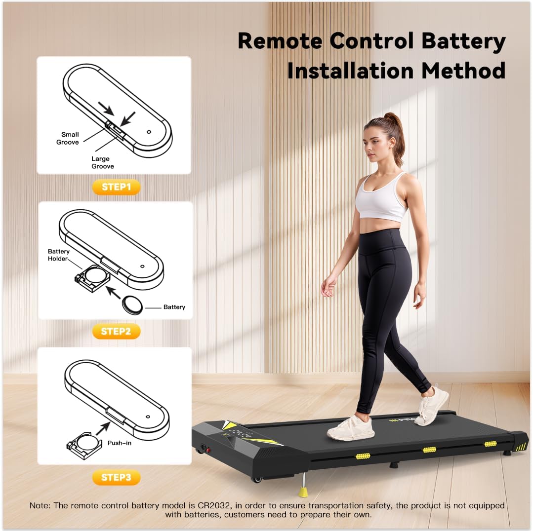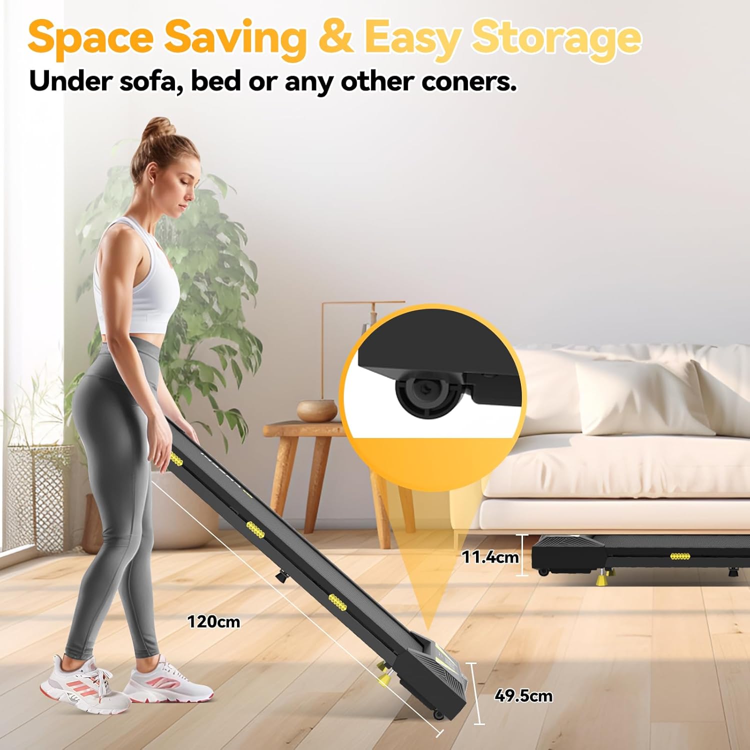 [Compact Design & Easy To Store And Move] : Our under desk treadmill are compact in design, measuring only 120*49*11.45cm and weighing only 19kg. With two rollers on the front, you can easily move the walking pad and place them under your bed or sofa.