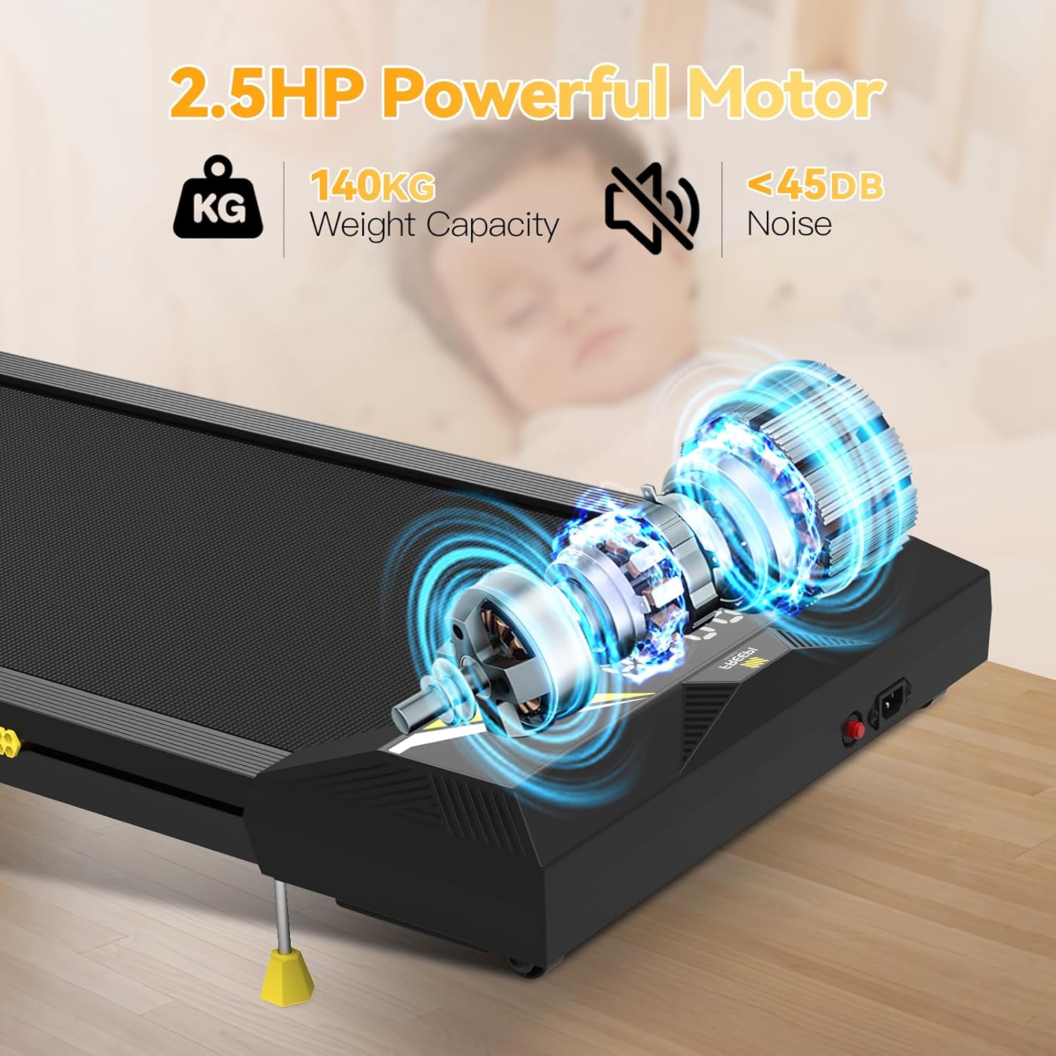 [2.5HP Powerful & Silent Motor] : The treadmill is equipped with a powerful 2.5hp motor that supports a maximum load bearing capacity of up to 140kg with excellent stability and load carrying capacity. Treadmill running noise is less than 45 dB, ensuring that you will not disturb neighbors while exercising.