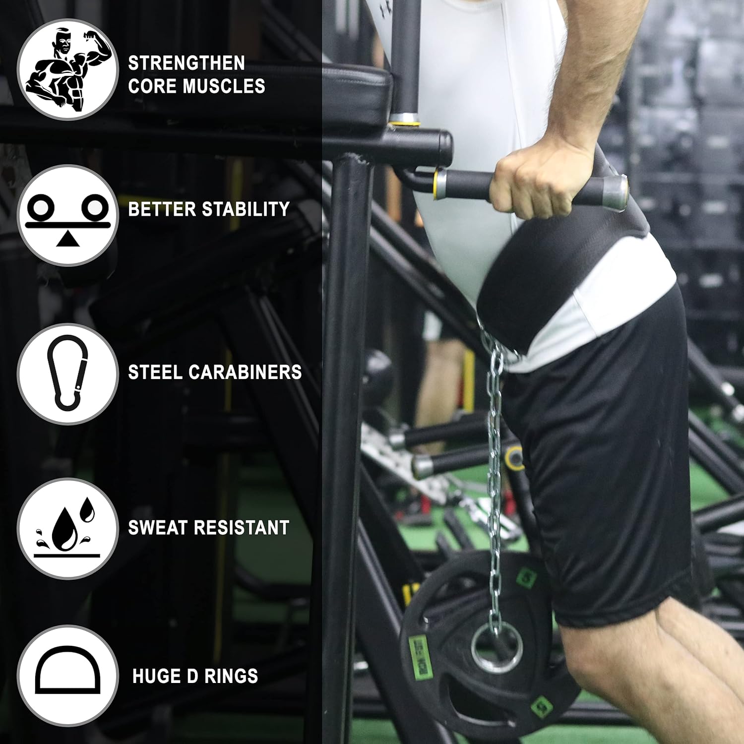 COMFORTABLE & SECURE FIT: Elevate your workouts with a heavy-duty 36-inch steel chain (including dual carabiners) a guarantee of unbeatable durability and peerless security. unleash your potential with our belt’s dual side adjustability and superior balance. Add more weights confidently, without compromising on comfort or utility. Enjoy a seamless experience with chain that effortlessly connect to the weight lifting dipping belt, sparing you from any pinching inconveniences