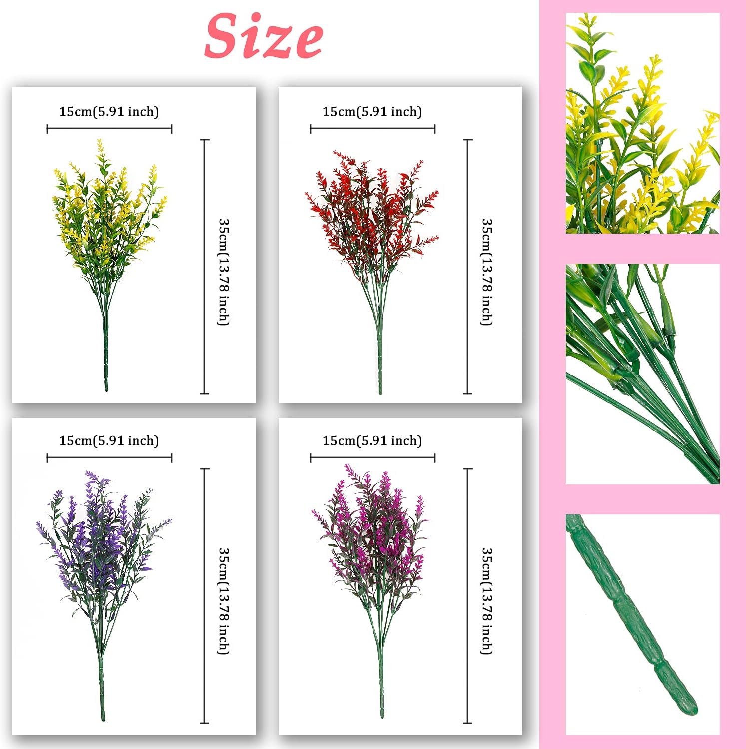 INCLUDES-12 Bundles artificial Plants Lavender. Size- Each plant approx 12.6 inch long, per lavender with 5 branches. MATERIAL-Flowers & Leaves: plastic; Stems: plastic-coated iron wire.