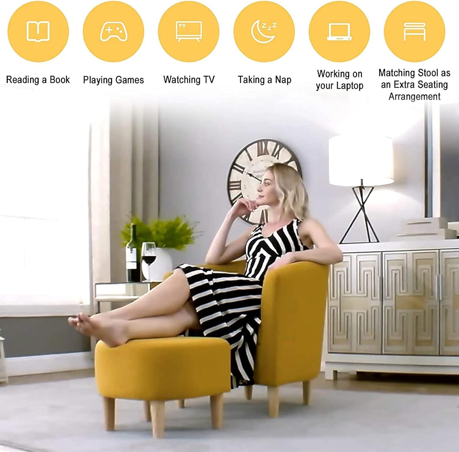 Armchair with Foot Rest: The armchair and footstool is designed with inspiration from modern recliner chairs and mid century chair. The curved silhouette surrounds the back to relieve your tiredness, and It comes with a footrest to rest your legs, a chair and footstool set are perfect in living room or as wingback chair, you can sit on it comfortably for TV watching, or add one in a corner of your bedroom for cosy reading.
