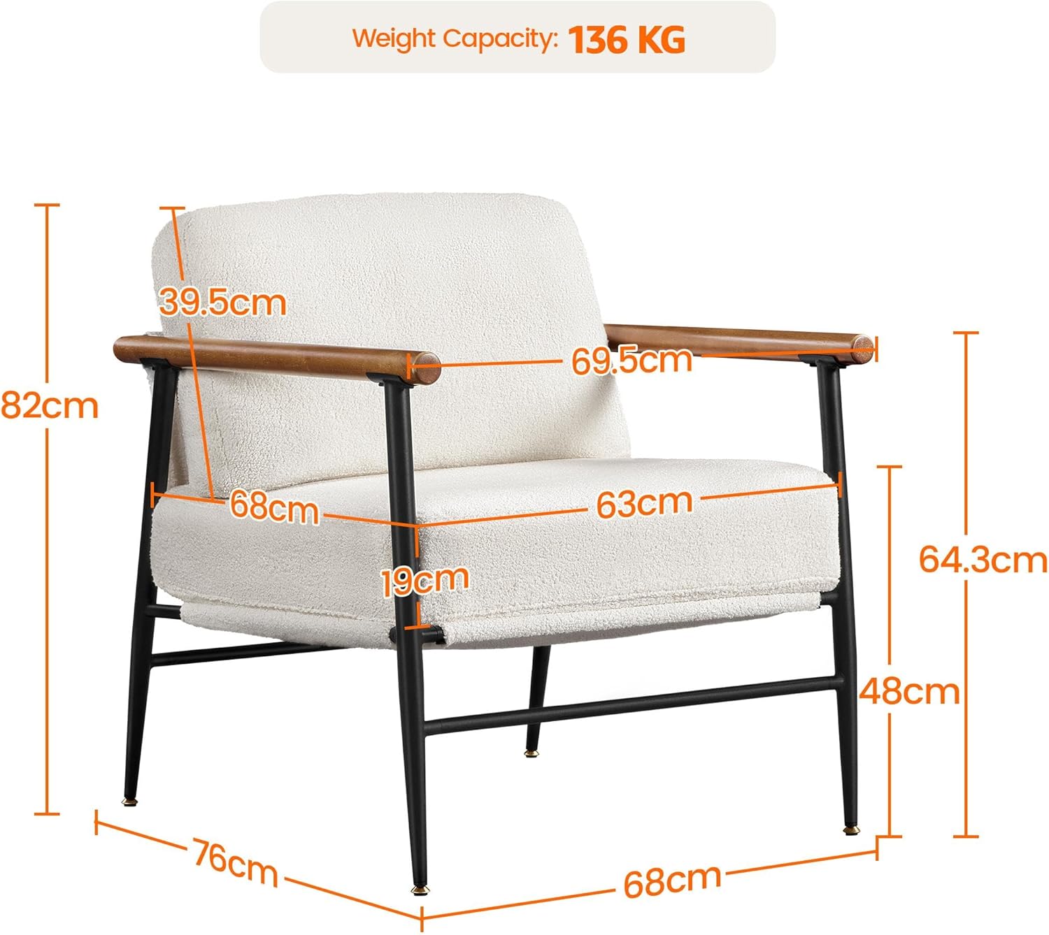 Soft And Durable Materials: Our boucle accent chair is made from soft and durable materials, including rubberwood, foam, metal, and polyester boucle fabric. Not only provide you with a plush sitting experience but also have a solid strong load