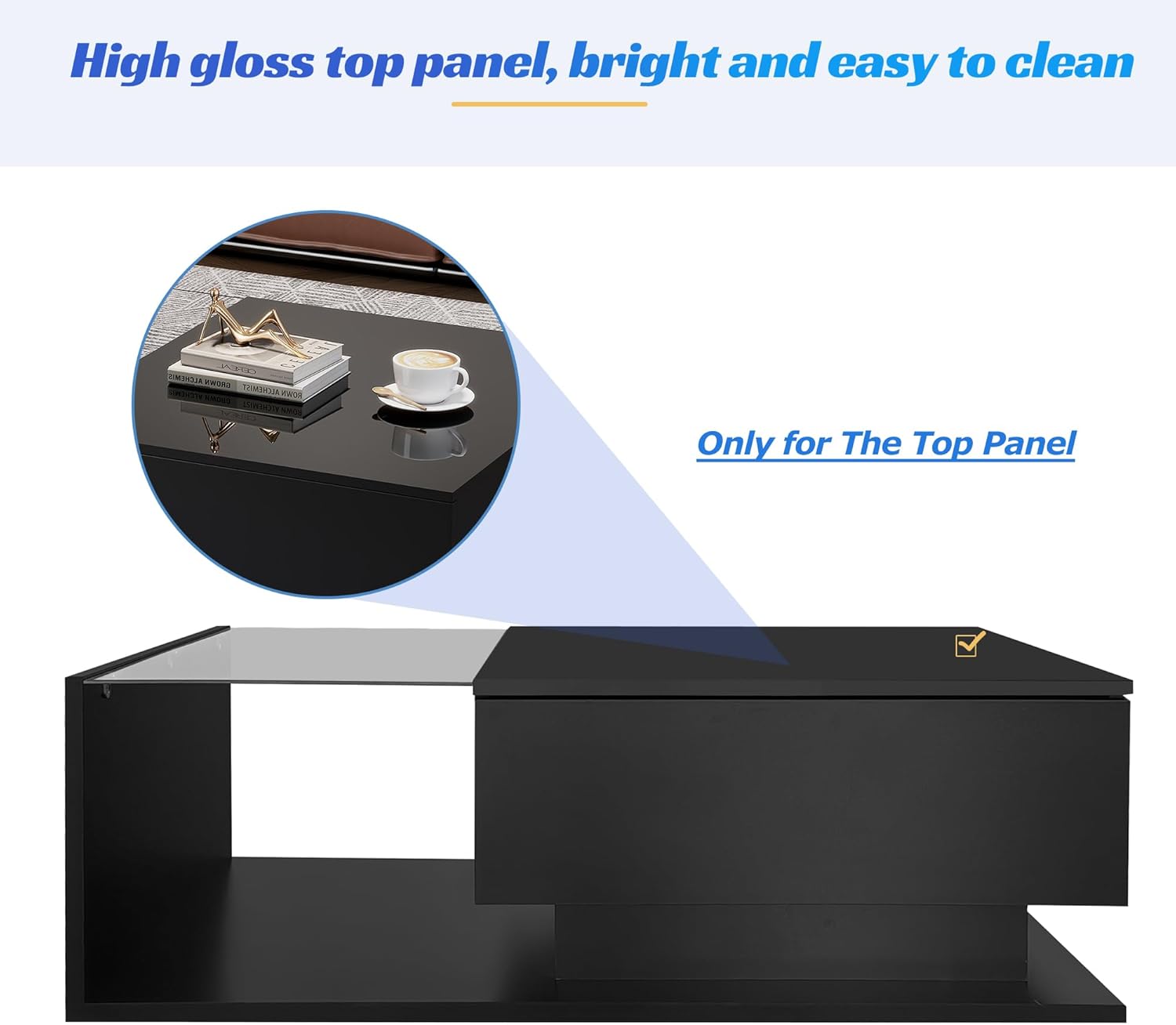 [High-Gloss Effect] The surface of coffee table with storage for living room is made of premium high-gloss, which is more smooth and easy to clean. Tips: The center living room table comes with a protective film on the surface, please peel it off after installation.(Only the top desktop is high-gloss, the rest of the area is matte).