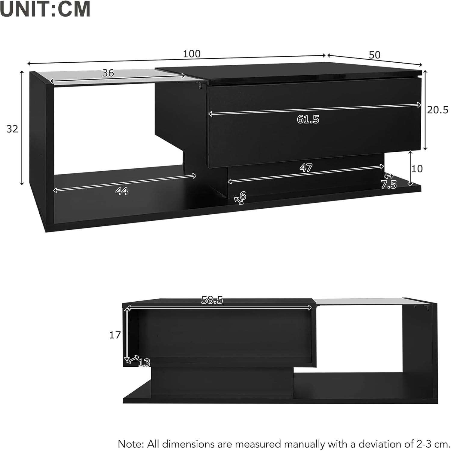 [Study Structure] Measuring L 100 x W 50 x H 32 cm. Crafted with a 5mm tempered glass top this coffee table with drawer fits perfectly in living rooms, reception areas, game rooms, bedrooms, basements, and offices. Designed with a sturdy support structure and high-quality waterproof PB, it ensures stability and durability for long-lasting use.