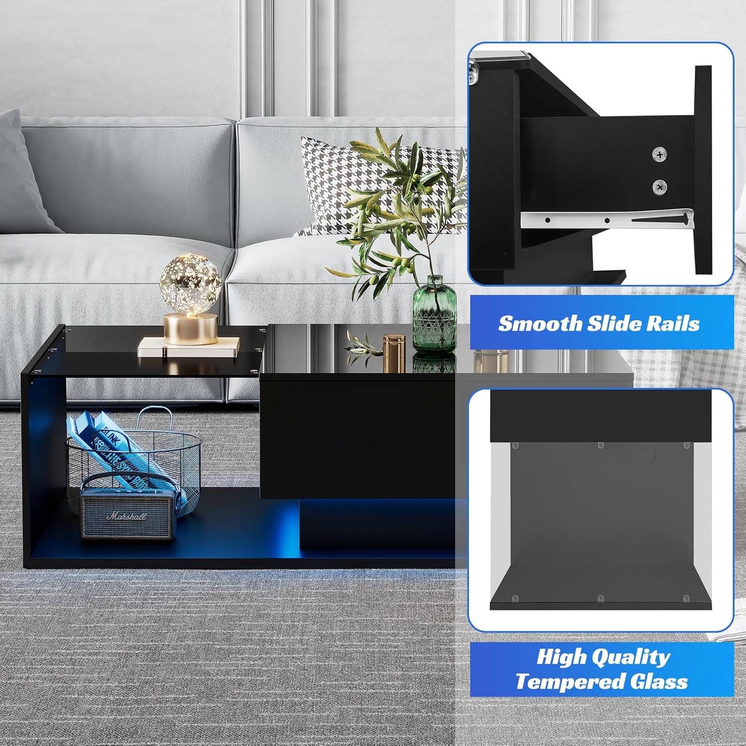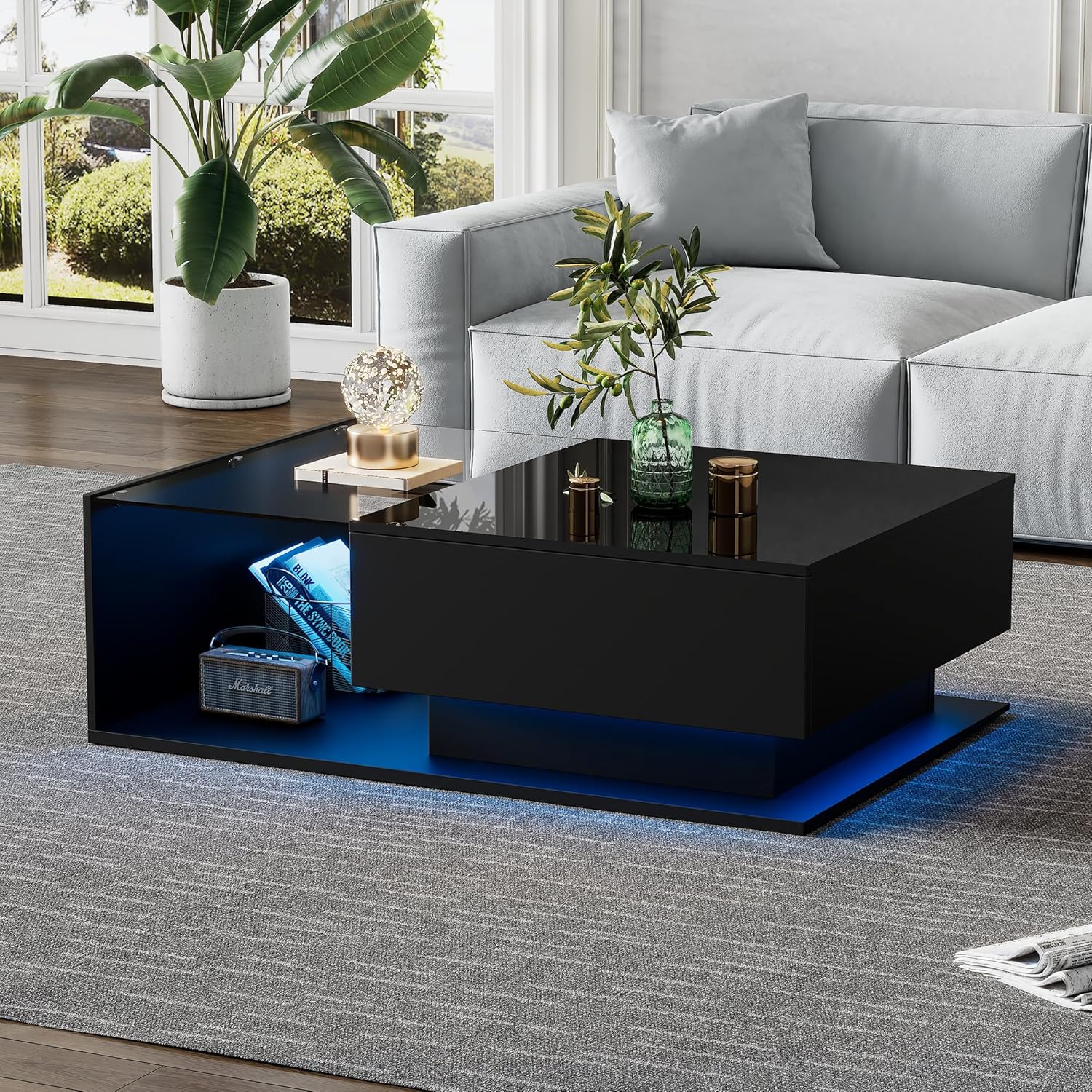 [High-Gloss Effect] The surface of coffee table with storage for living room is made of premium high-gloss, which is more smooth and easy to clean. Tips: The center living room table comes with a protective film on the surface, please peel it off after installation.(Only the top desktop is high-gloss, the rest of the area is matte). [Large Storage Space] 2-Tier and one drawer modern coffee table provides you with enough space to display various items and decorations, such as magazines, books, remote controls, or other living room essentials, making the tabletop neat and orderly. [Study Structure] Measuring L 100 x W 50 x H 32 cm. Crafted with a 5mm tempered glass top this coffee table with drawer fits perfectly in living rooms, reception areas, game rooms, bedrooms, basements, and offices. Designed with a sturdy support structure and high-quality waterproof PB, it ensures stability and durability for long-lasting use. [Smart APP RGB LED System] The LED light controls through the APP of the mobile phone, and you can directly connect to the RGB LED lighting system through the mobile phone, and turn on,off the light and change the light color through the mobile phone at any time. [Easy to Assemble] Coffee table with led comes with numbered parts and clear diagrams to make assembly as easy as a puzzle.Follow the details instructions, assembly can be completed by one person within 30 minutes.The 1.5cm thick wood tabletop gives the led coffee table excellent weight-bearing capacity and can support up to 30-50 pounds.