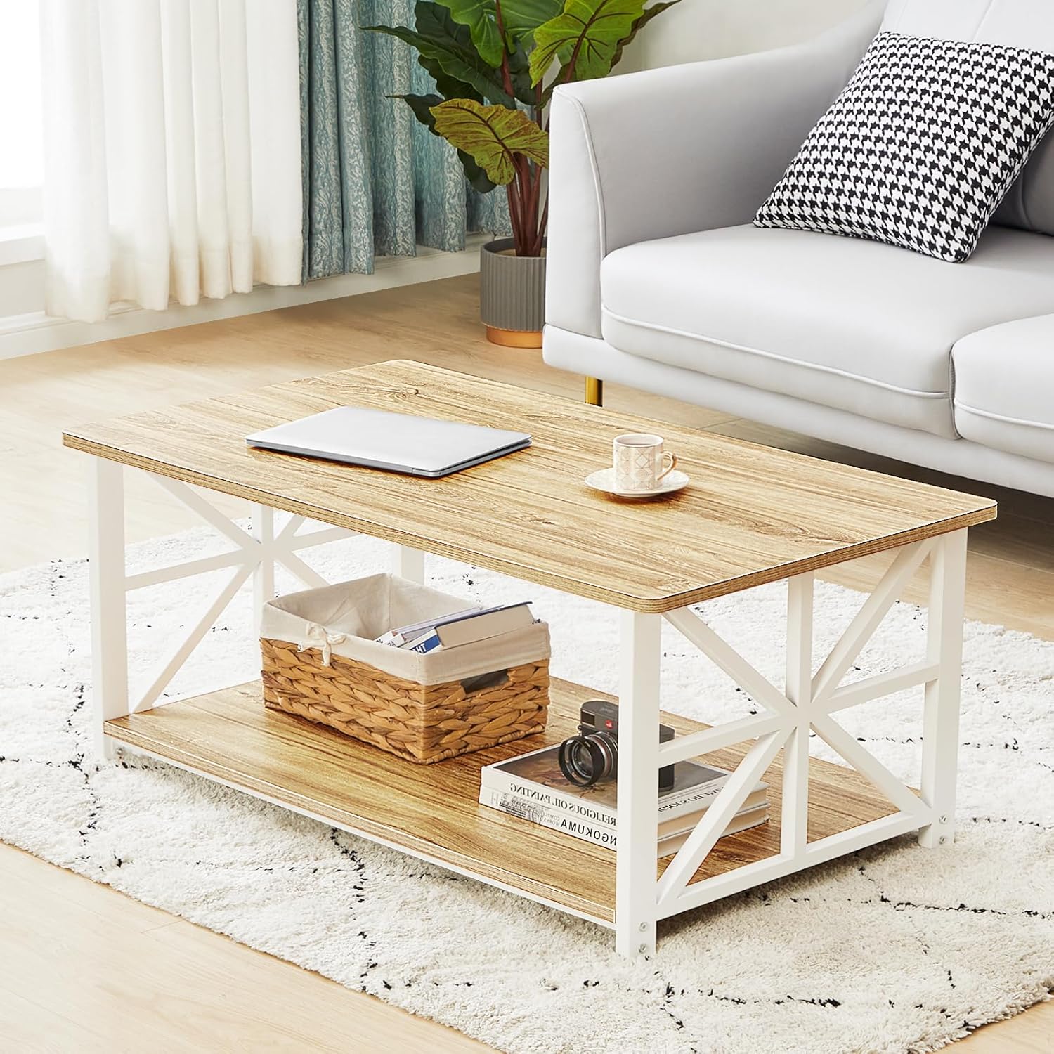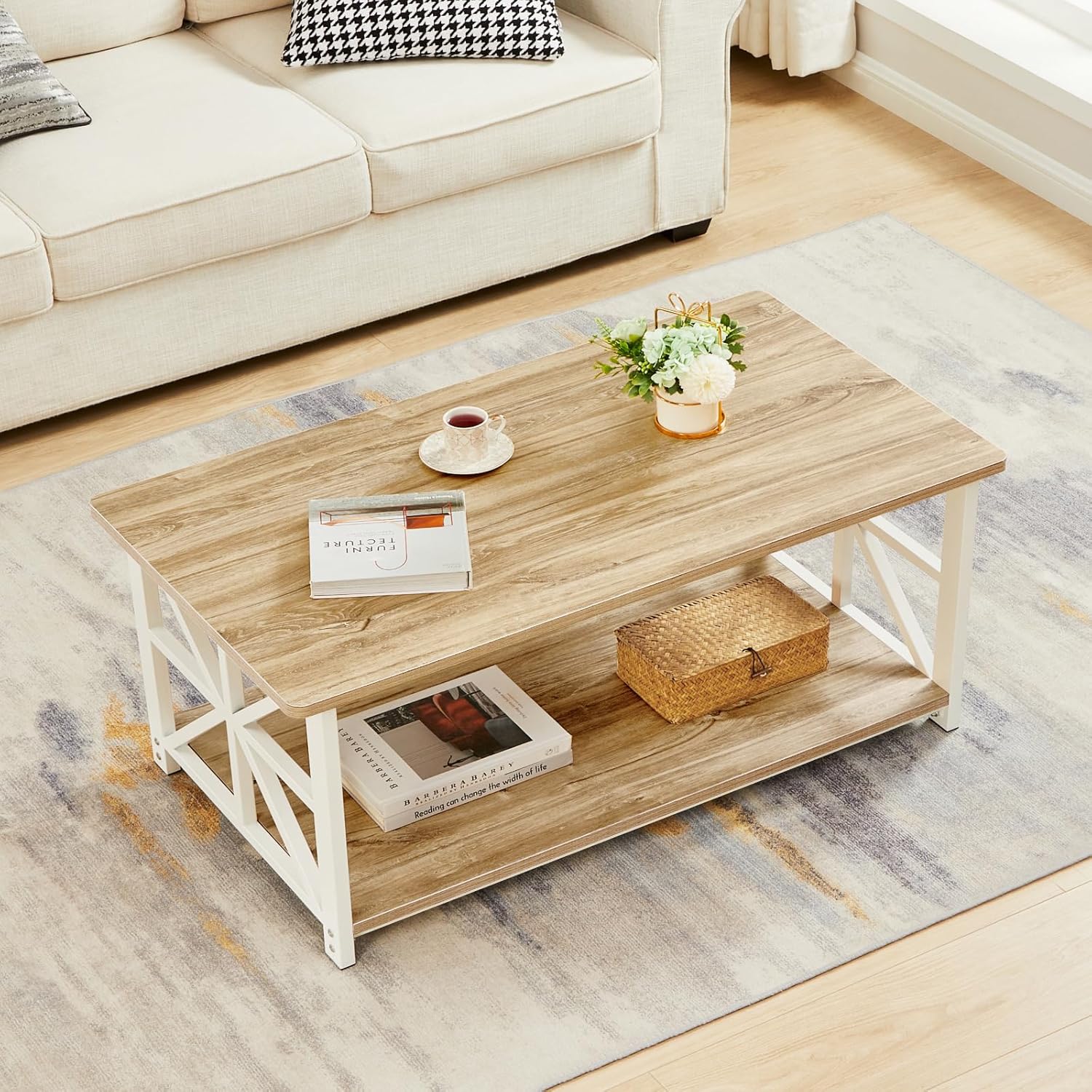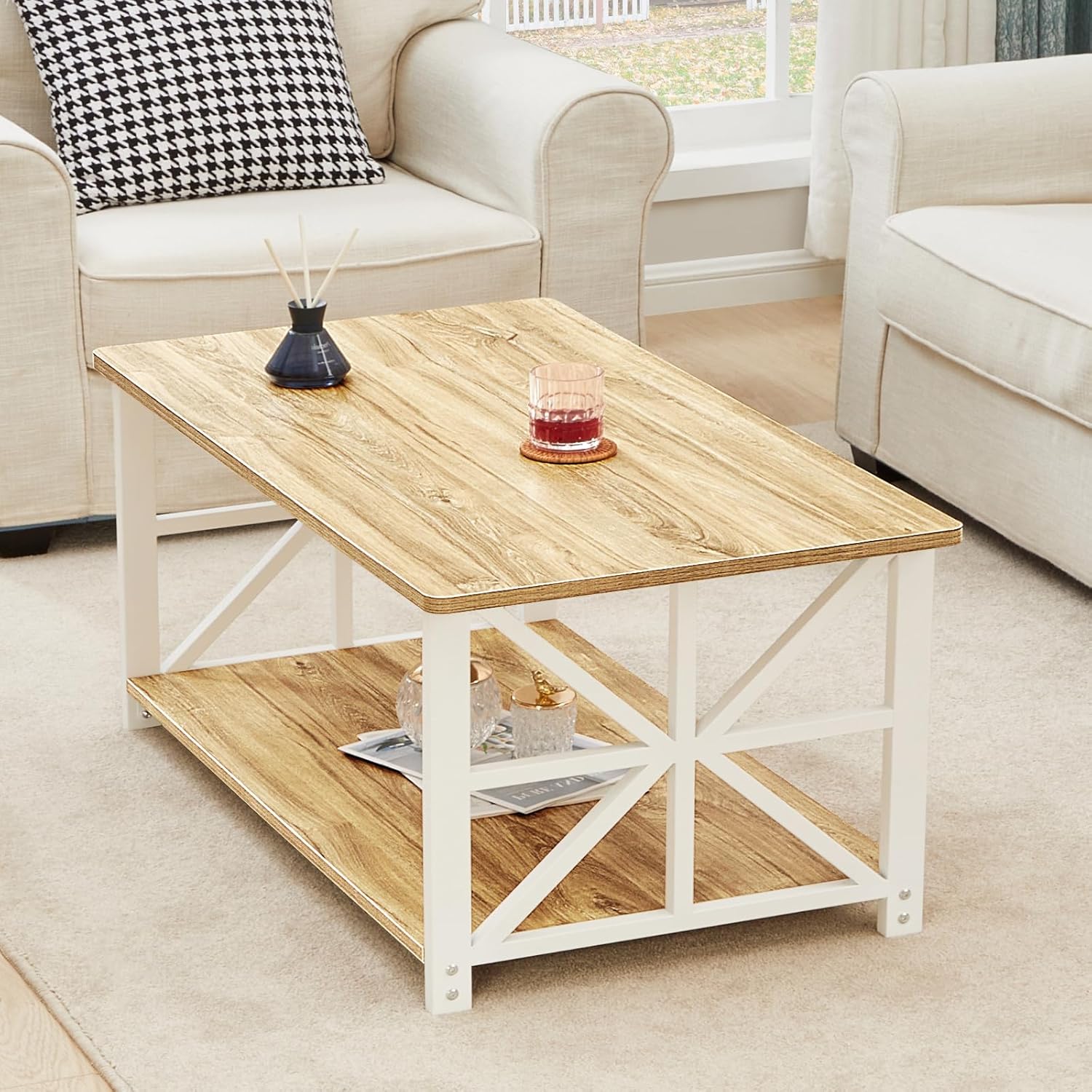 GreenForest Coffee Table with 2-Tier Storage,100 cm Living Room Table with Round Corner, Center Table with X-Frame Design for Home Office,Oak
