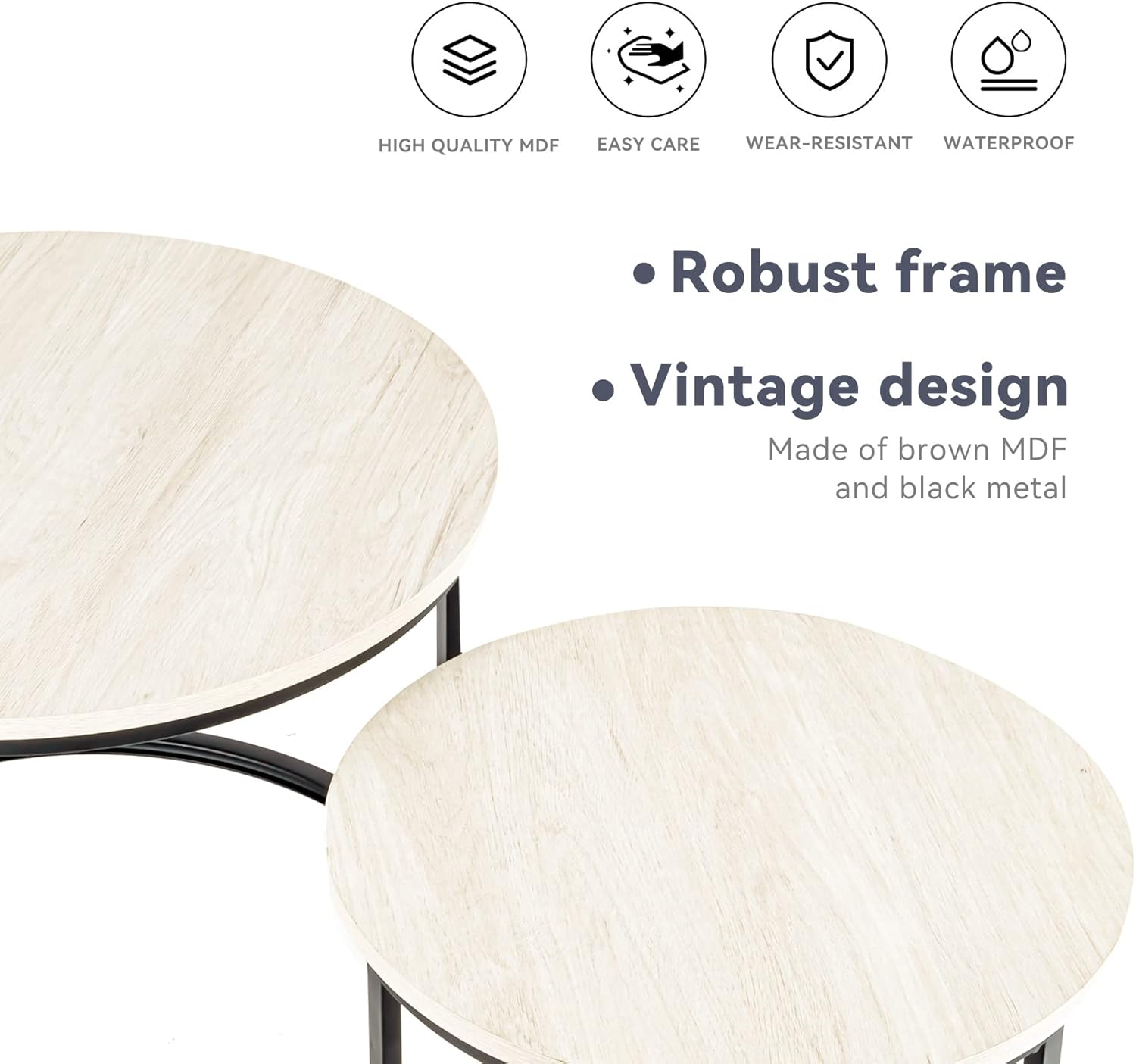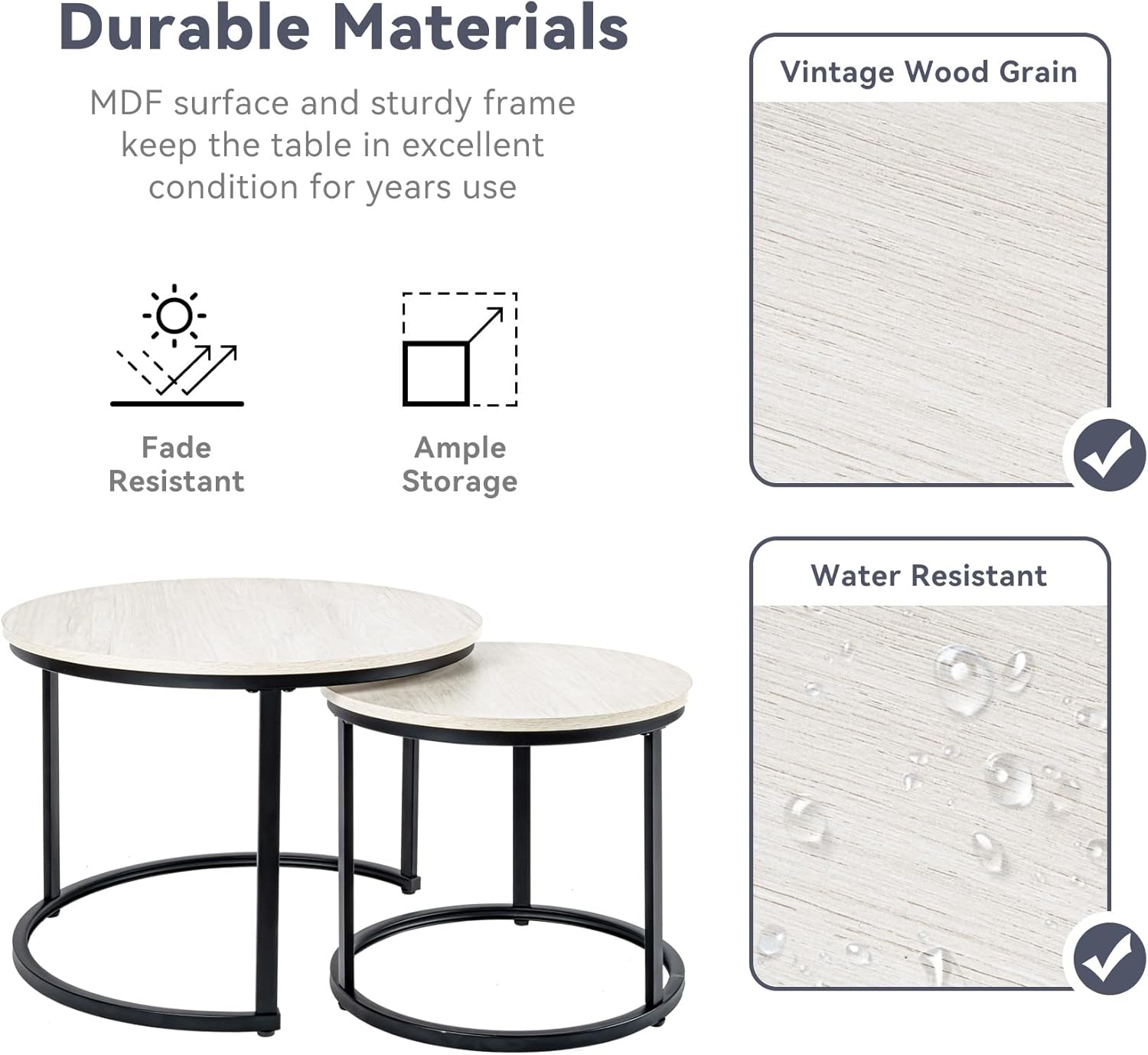 【Doubled surface area 】Compared with other coffee tables, this nesting table set is designed with two spacious round tabletops, which maximizes the storage space for you. The wood-like grain on the top adds a natural accent and shows your unique taste