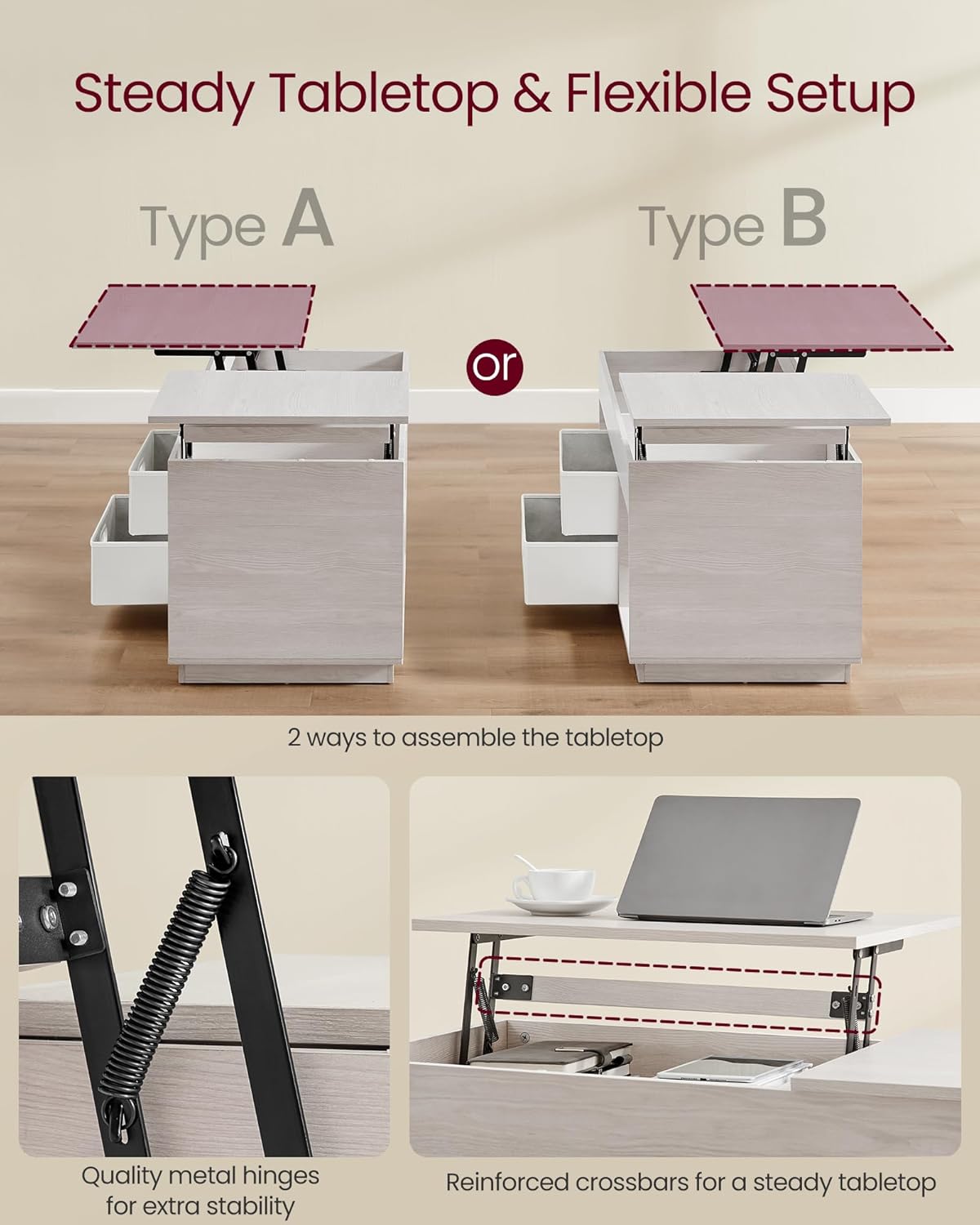 【STEADY. SILENT. SAFE】The premium metal hinges and reinforced crossbars of this living room table ensure the tabletop lifts and lowers steadily and quietly, providing stable support and minimising pinch risks during lowering